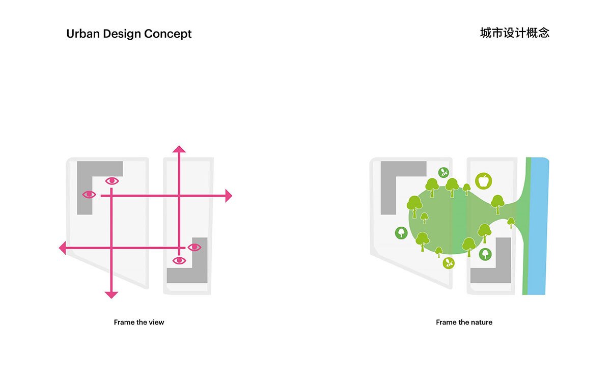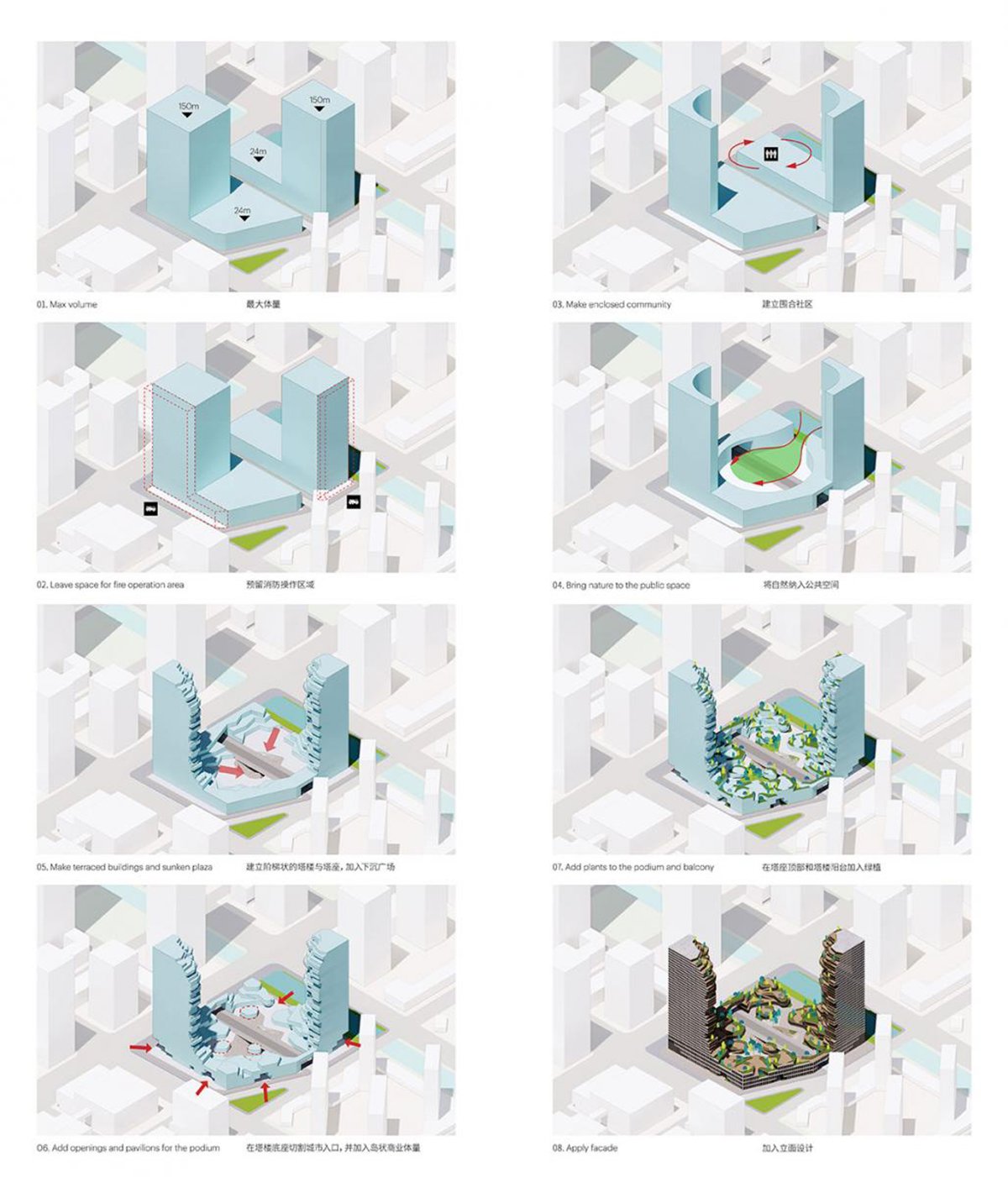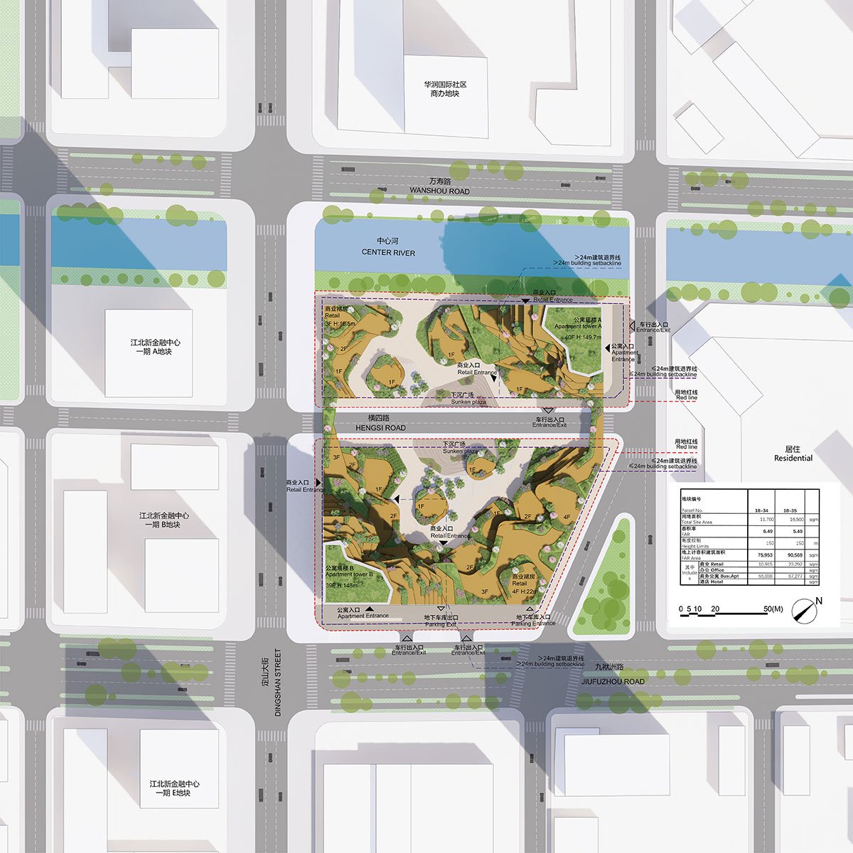 The project spans two adjacent blocks on the edge of the Jiangbei Financial District masterplan. The project’s two L-shaped towers, each 40 storeys in height, face each other from the north and south corners, while the podium of 3–4 storeys form a perimeter that encloses almost the entire site to create the protective environment at its heart. This perimeter building bridges over pedestrian access routes and even the street between the two plots, creating a clear separation between the surrounding neighbourhood and the oasis at the centre of the design.