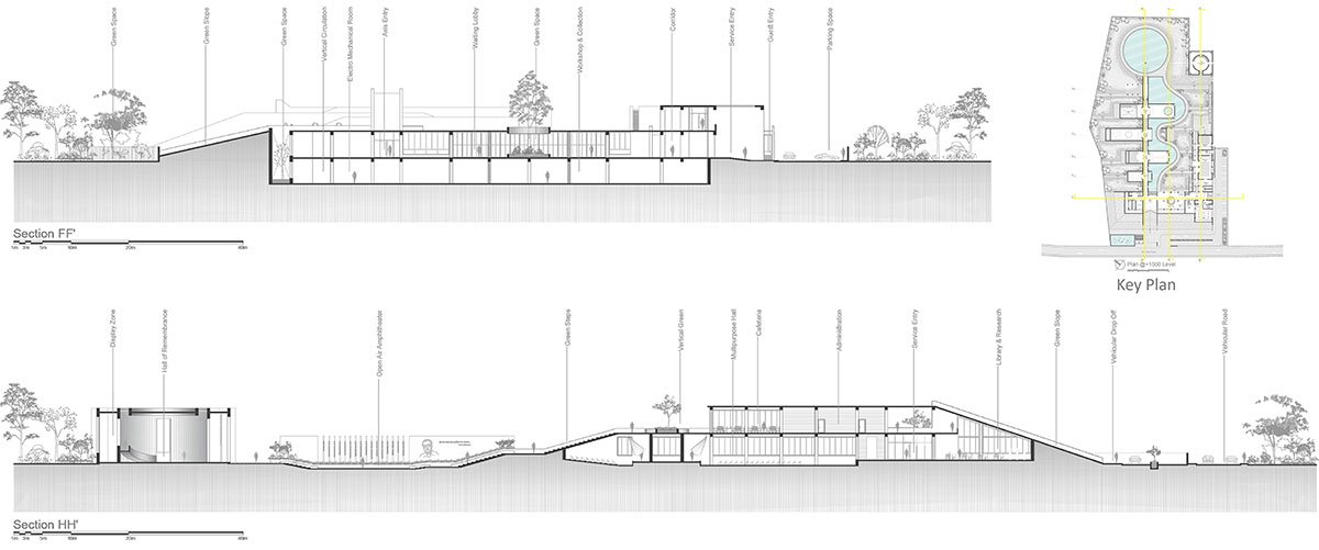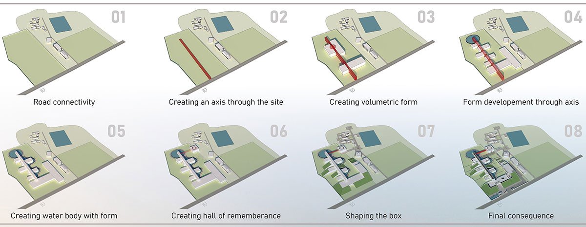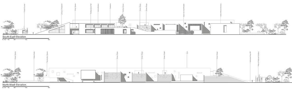 Conclusion: By carefully combining architectural design elements with natural elements, the project successfully creates a space that evokes diverse emotions. By guiding visitors through a journey that highlights each phase of Tajuddin Ahmad’s life through a play of volumes along a fixed axis, it stays true to its concept.