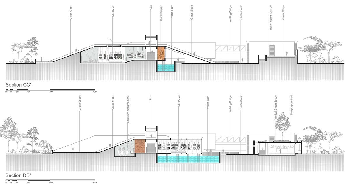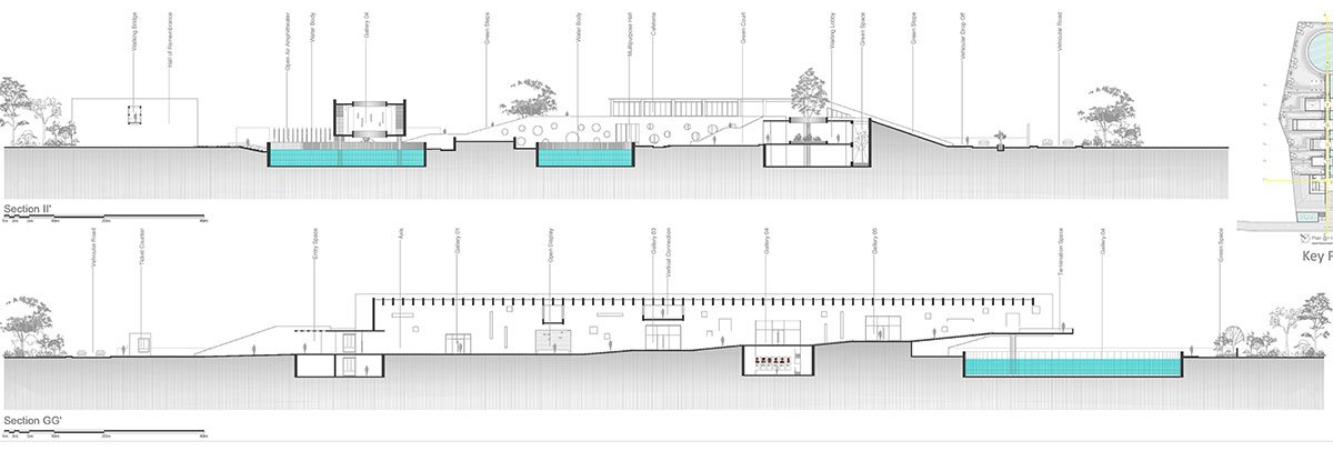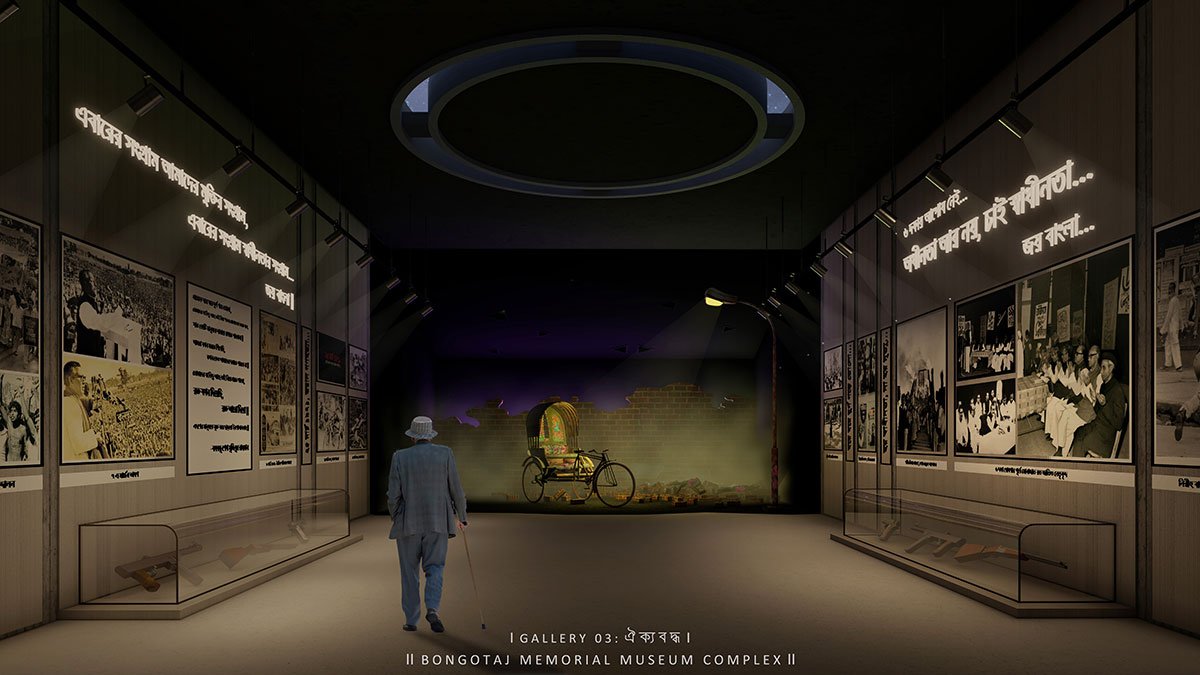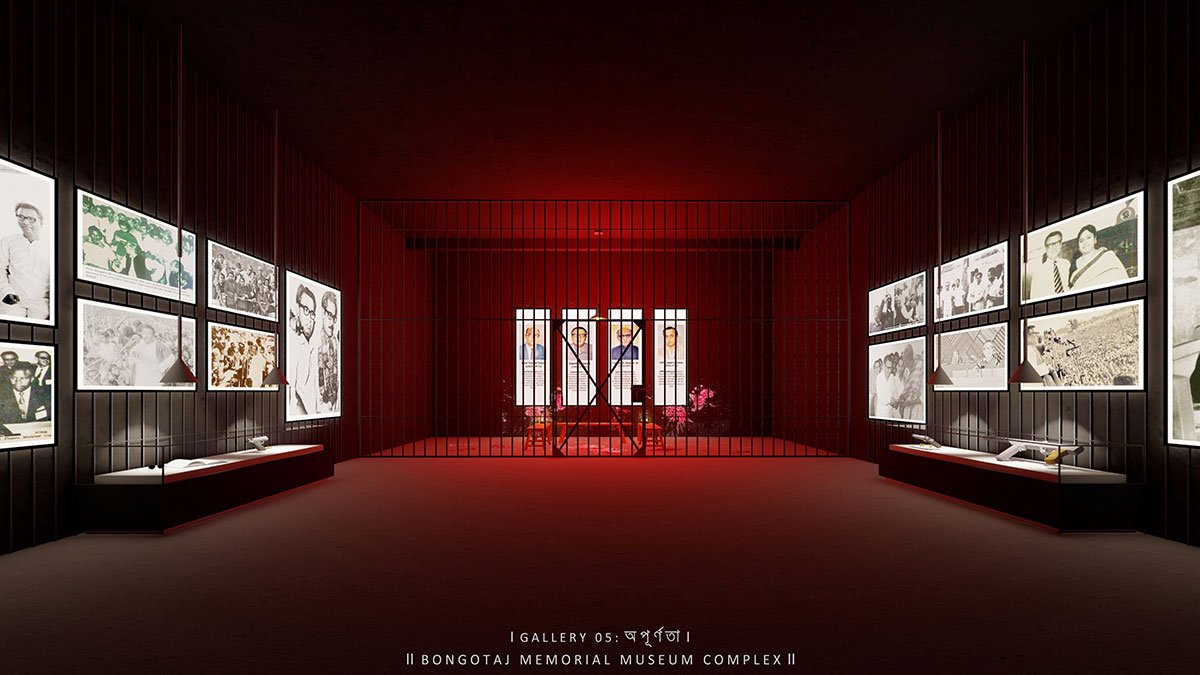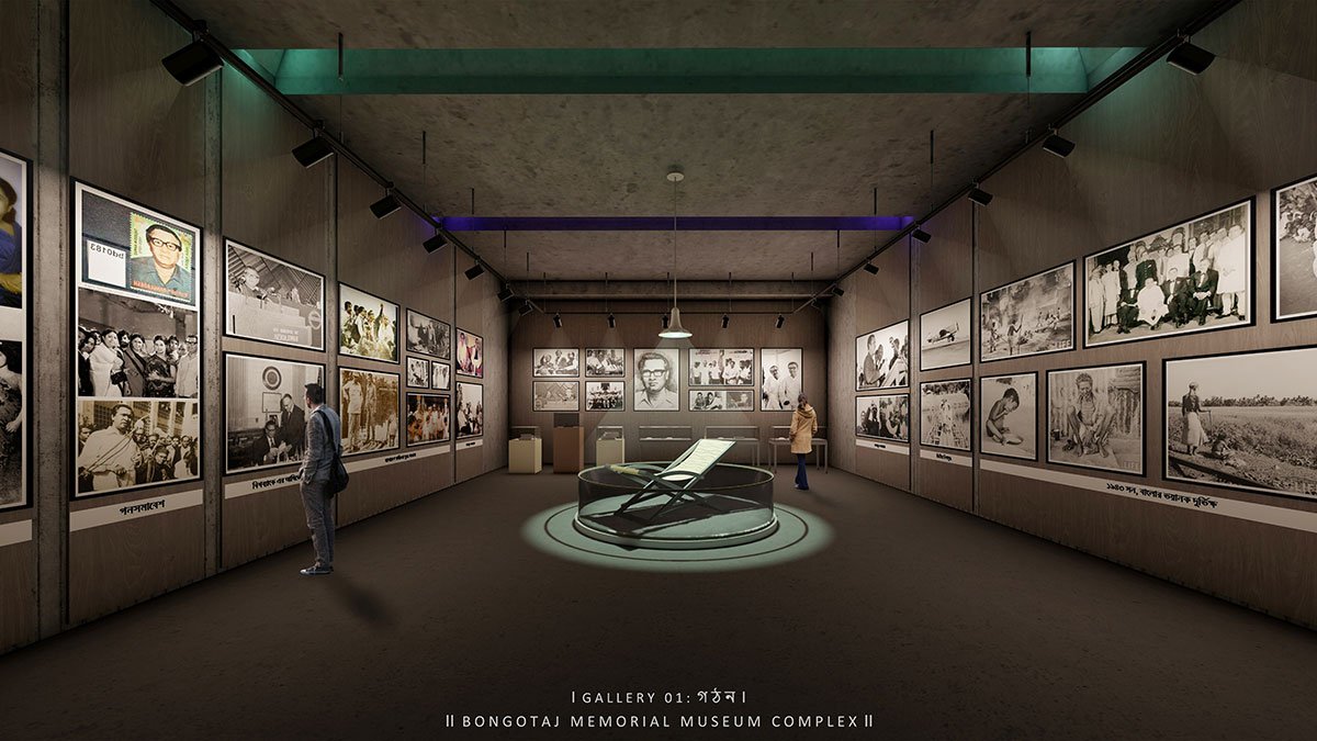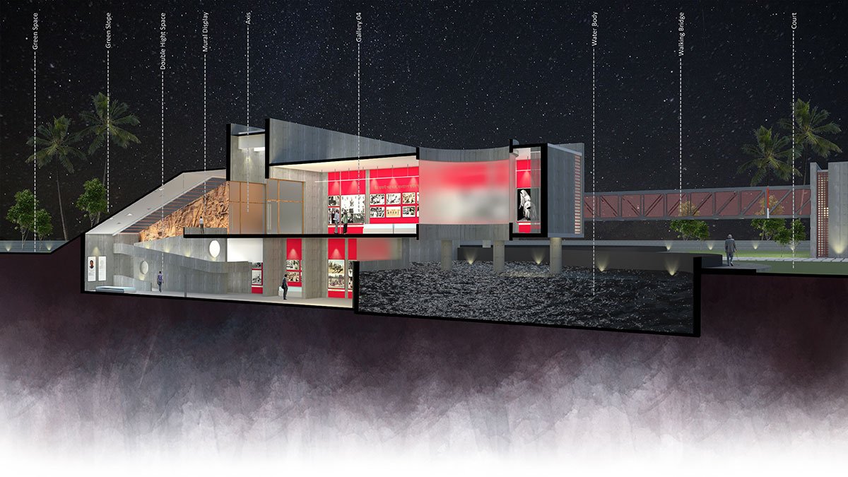 Five gallery spaces are combined to create a continuous water body. Water is used as a guiding element and to mimic Bangladesh’s deltaic landscape. The visitors are guided to the destination by water channels and the sound of flowing water; the terminal is designed to evoke a sensual emptiness that serves as a reminder of Tajuddin Ahmad’s absence.