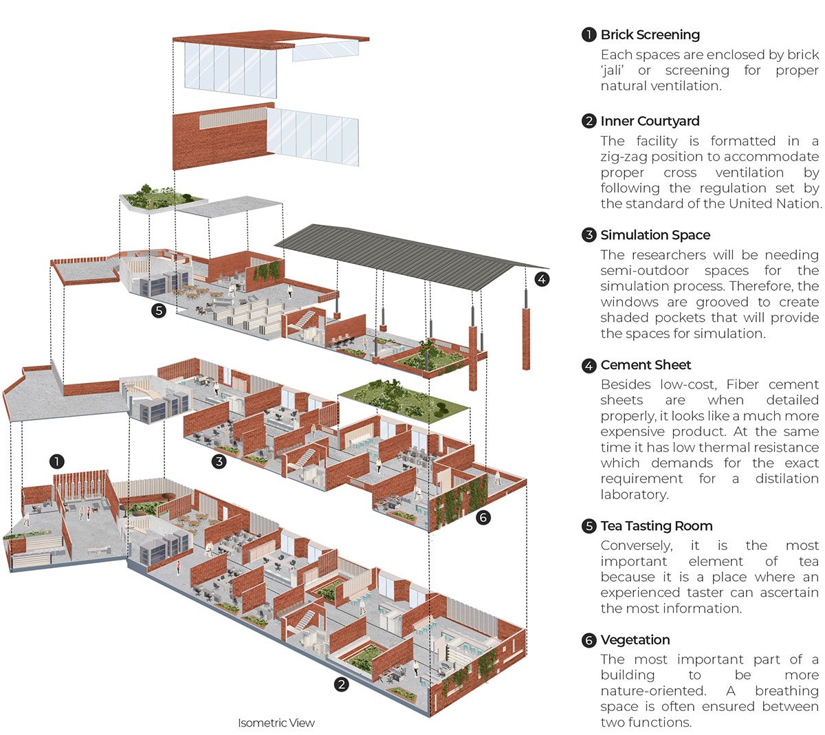 Conclusion:Through the interconnectivity of the facility’s spaces, the architecture thesis aims to encourage interaction among researchers, tea workers, and the general public. The project also welcomes tourists to explore the tea gardens and promotes the country’s traditional tea stall culture while acknowledging the value of knowledge, culture, and heritage in the tea production industry.