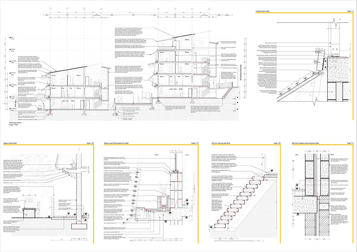 Responding to the steep site, the project evolved through iterative testing of terracing strategies, eventually forming three terraces that organize circulation and housing. The central terrace became a pedestrian spine, while housing was arranged on either side. Unit design followed a modular 4×8m grid, allowing units to be combined into clusters and clusters into co-operatives. Throughout the process, five guiding principles — interface, open network, intensity, life cycle, and flexibility — were used to test decisions at every scale, from site organization to material choice, ensuring coherence between concept, form, and use.