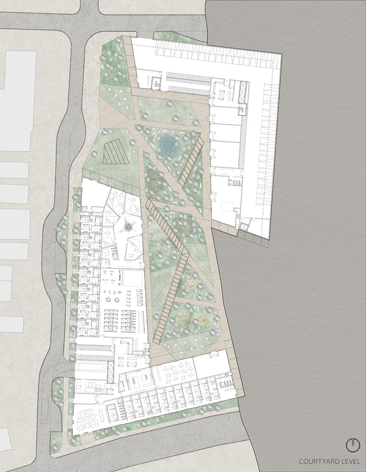 The project is prompted by the proposed LRT line, planned to terminate at the Ainslie Station. Instead, the design repositions the terminal to allow for future extension, connecting more communities along the route. Major traffic is redirected away from the heart of Galt to Wellington Street, opening the city core for pedestrians. Two fragmented triangular sites are merged into one block shared between the new station and Crop Co-op. The program combines housing with public and semi-public spaces—a restaurant, daycare, art gallery, fitness studio, bike shop, soup kitchen, and social service offices—all centered around a courtyard that supports food growing and gathering. These functions overlap and support one another, creating a living infrastructure that connects mobility, food, and housing at the scale of the city.