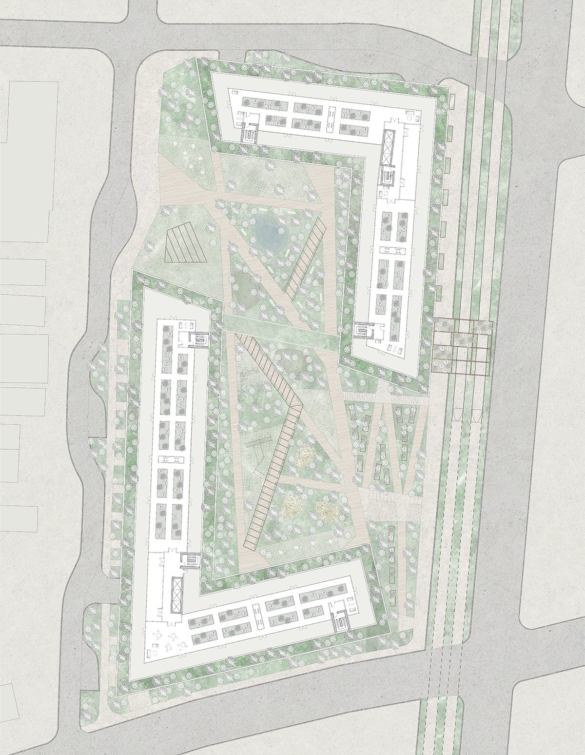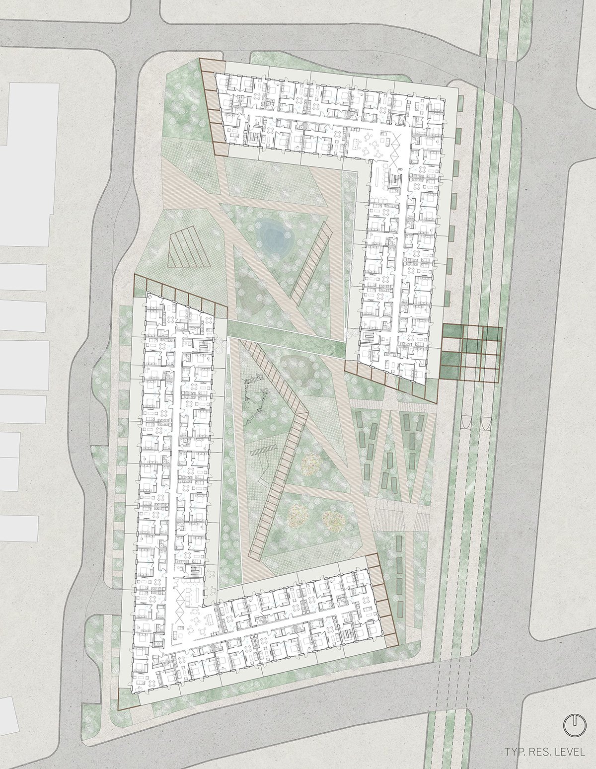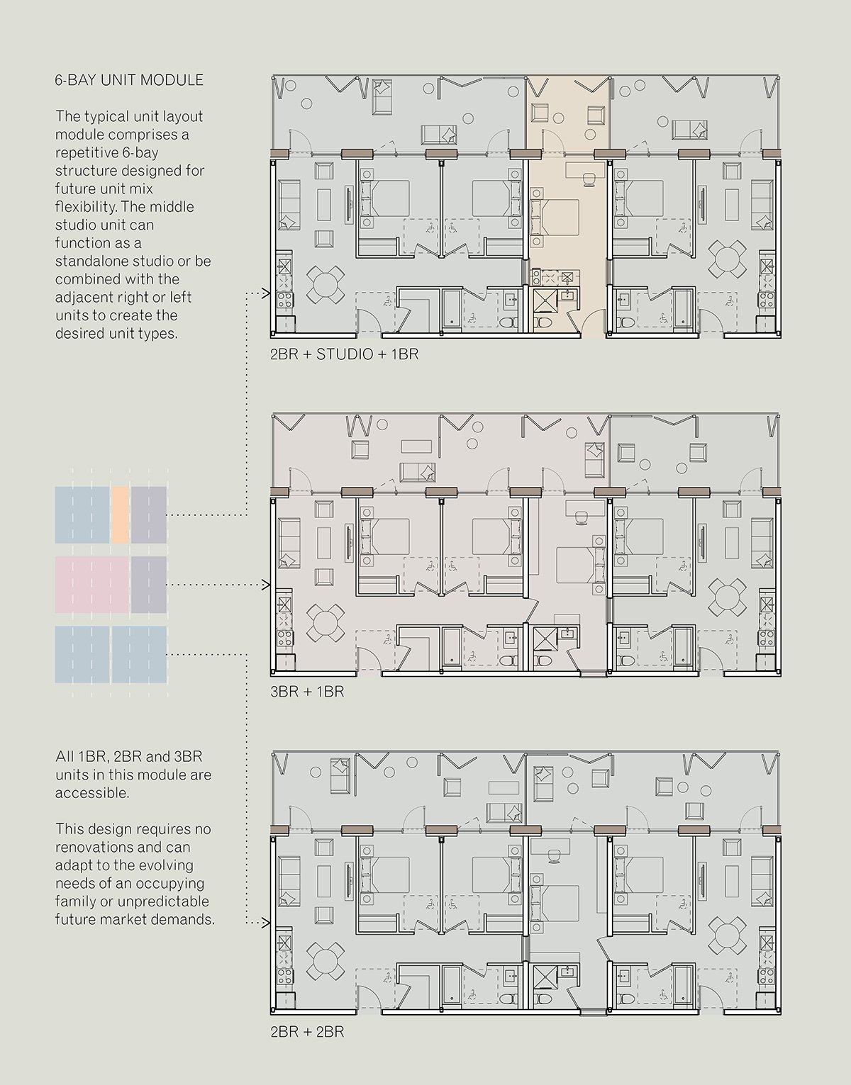 The final proposal explores how modular housing could integrate sustainability at multiple scales – from structure to daily life. The design sought to meet most daily needs of residents on site, moving toward a more self-sufficient model of living. The six-bay unit system was developed as a flexible framework, allowing for a flexible unit mix without additional construction or material and energy waste.