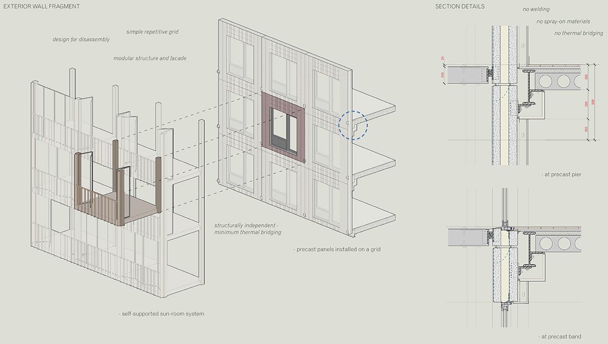 The prefabricated grid and modular wall panels suggest a construction logic that could simplify assembly and make future disassembly practical. The independent sunroom system was imagined as a way to provide outdoor space for every unit while improving thermal performance and extending the potential for food growing at the private scale.
