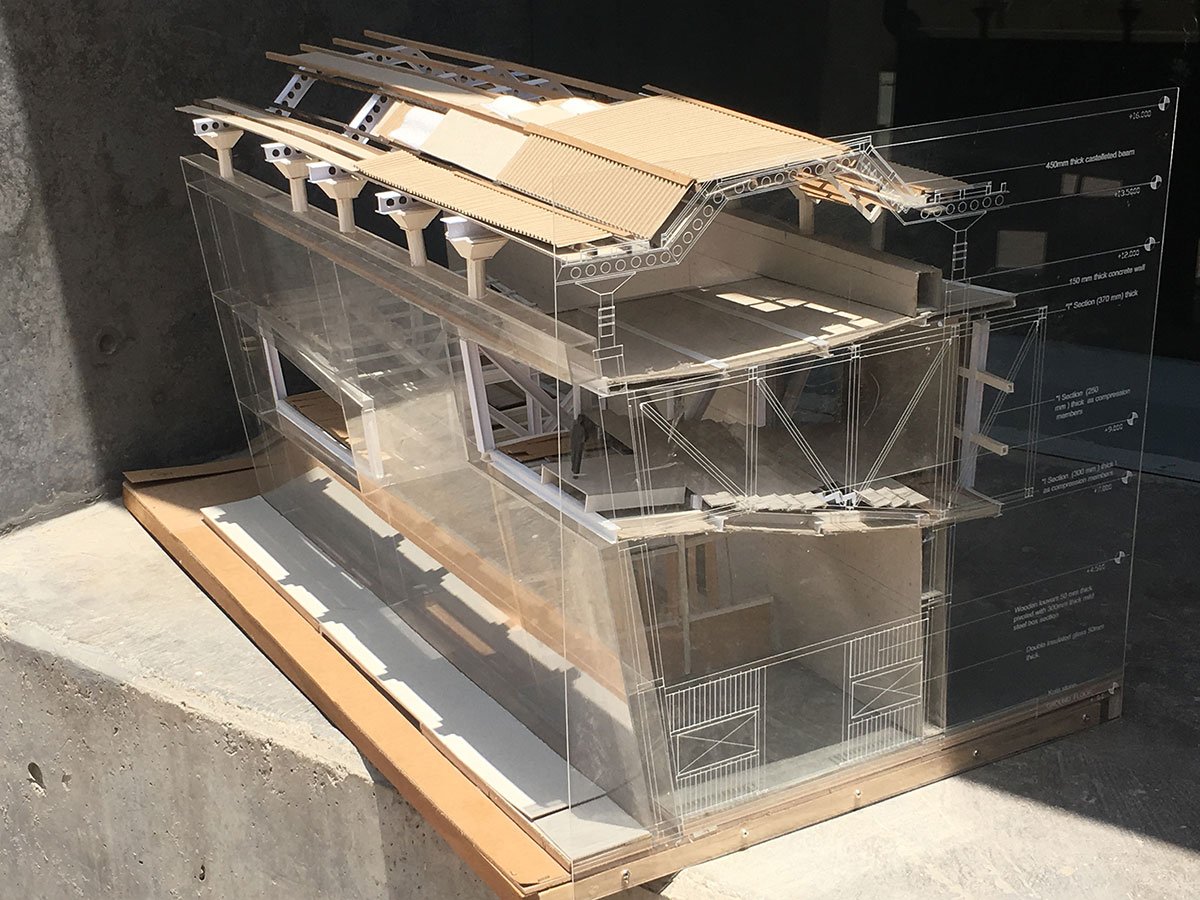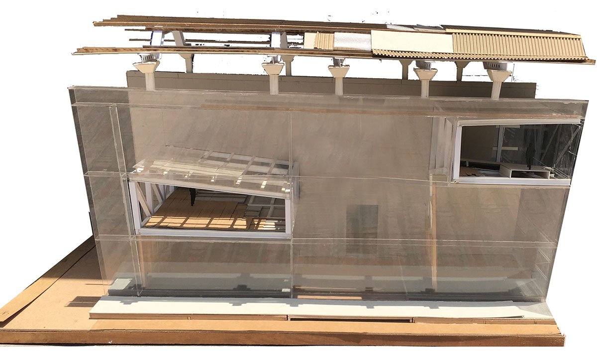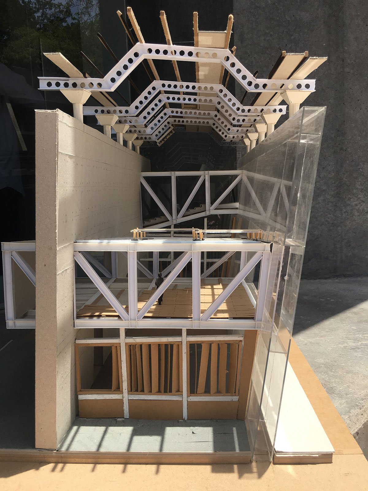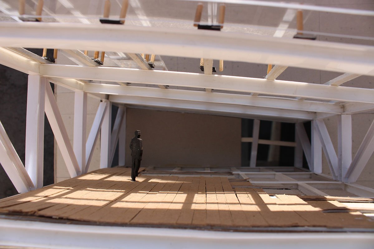 Exploration of roof structure process models using castellated I beam, corrugated sheets and louvred windows to control light and wind, ensuring minimal direct sunlight entry.