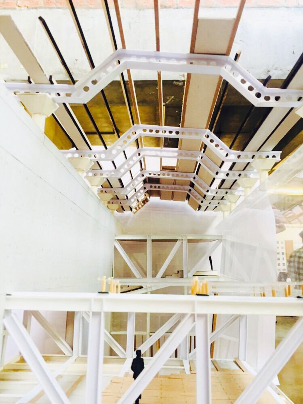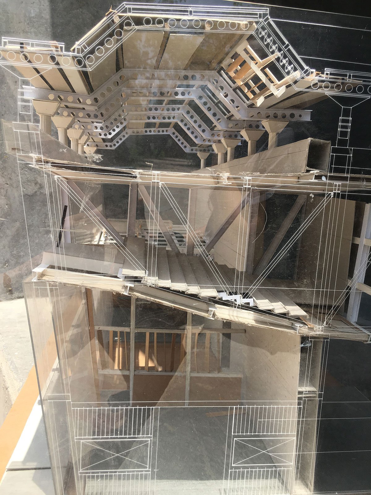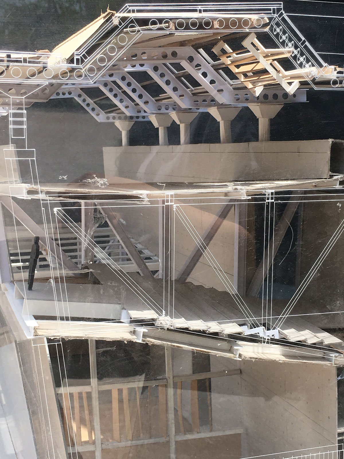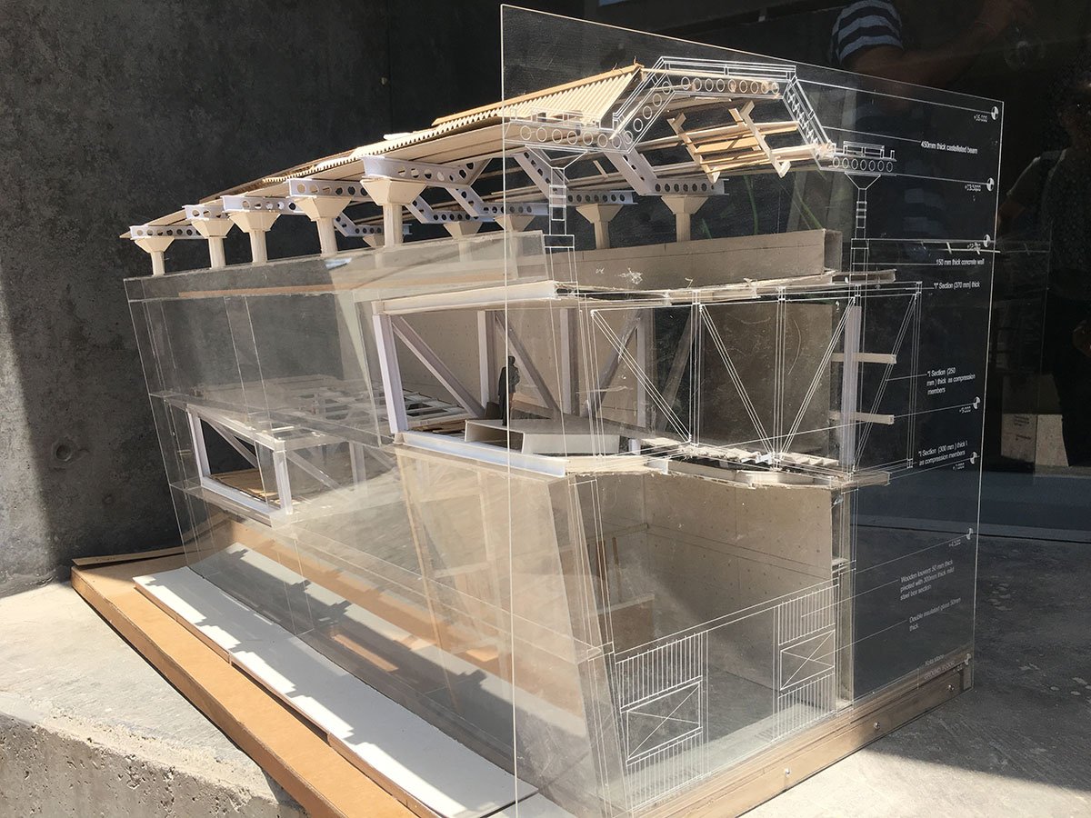 Part model of the 2nd bay from the North side of the interpretation. It houses a double heightened Auditorium, Exhibition space for architectural elements, Exhibits for Clay and a Photographic Studio.The wall section shows the typical joinery junction between the concrete cavity walls with the truss modules and the Castellated “I “beam roof.”