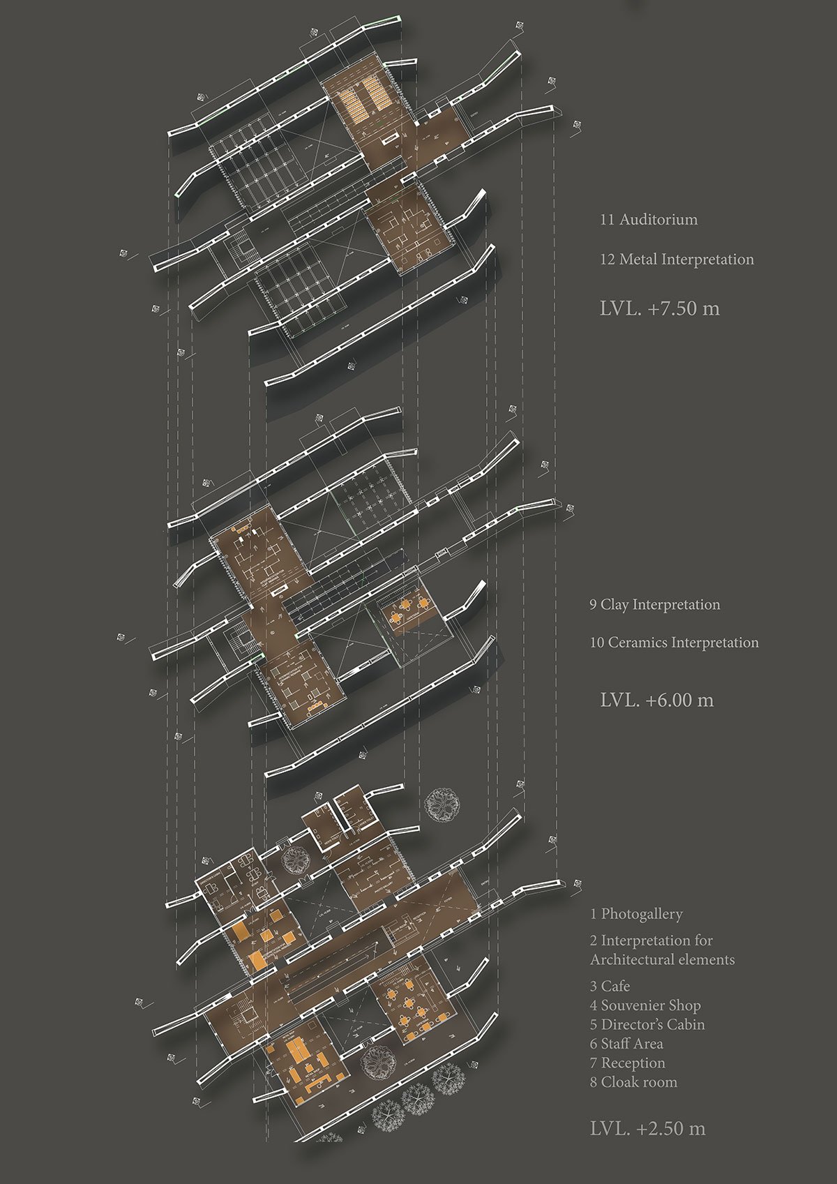 The first floor of the building caters to Exhibition space for clay and Ceramics objects which are a part of the Metal Truss Cuboidal spaces.The second floor of the building is dedicated to the Auditorium room and Exhibition of the Metal elements.