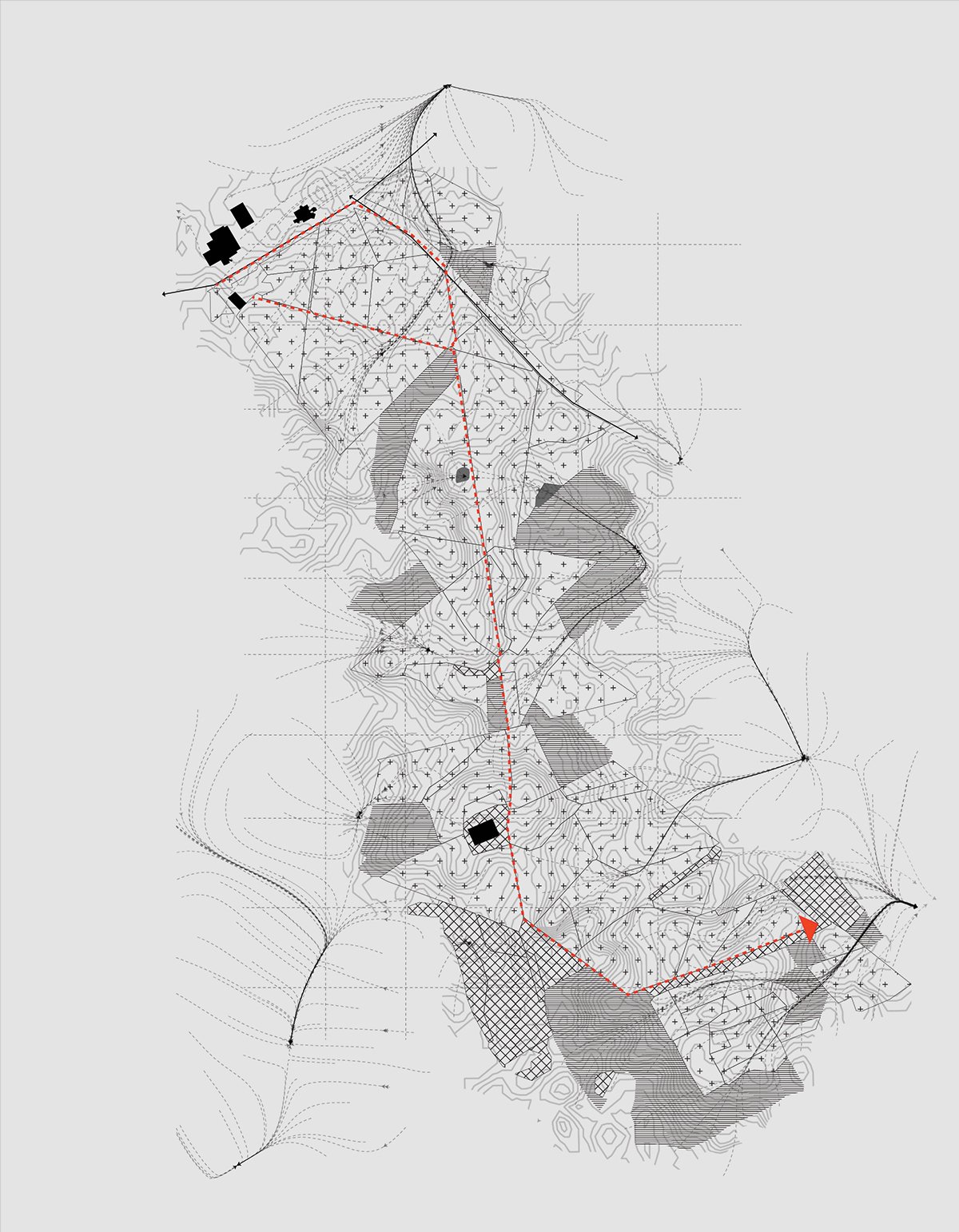 The design process began with an interface typology study to identify the main walking route, which became the primary axis for site exploration. This analysis informed the development of a contour-based firebreak that traverses the forest, strategically fragmenting it while passing through steep slopes and priority habitats most vulnerable to wildfire.