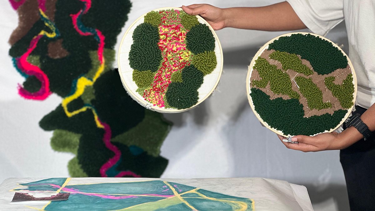 To test and refine the firebreak concept, tufting and weaving exercises were employed as exploratory tools. These tactile studies reimagined the firebreak not as a line of separation but as a connective system linking diverse parts of the forest. The resulting tapestry expressed layered ecological relationships — such as moisture gradients, biodiversity, and human interactions — flowing dynamically along the contour.