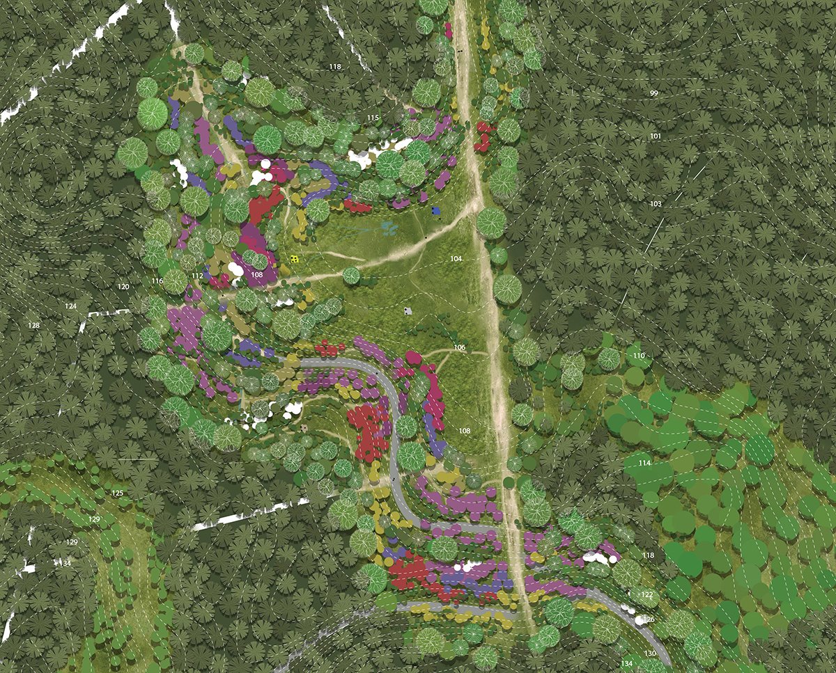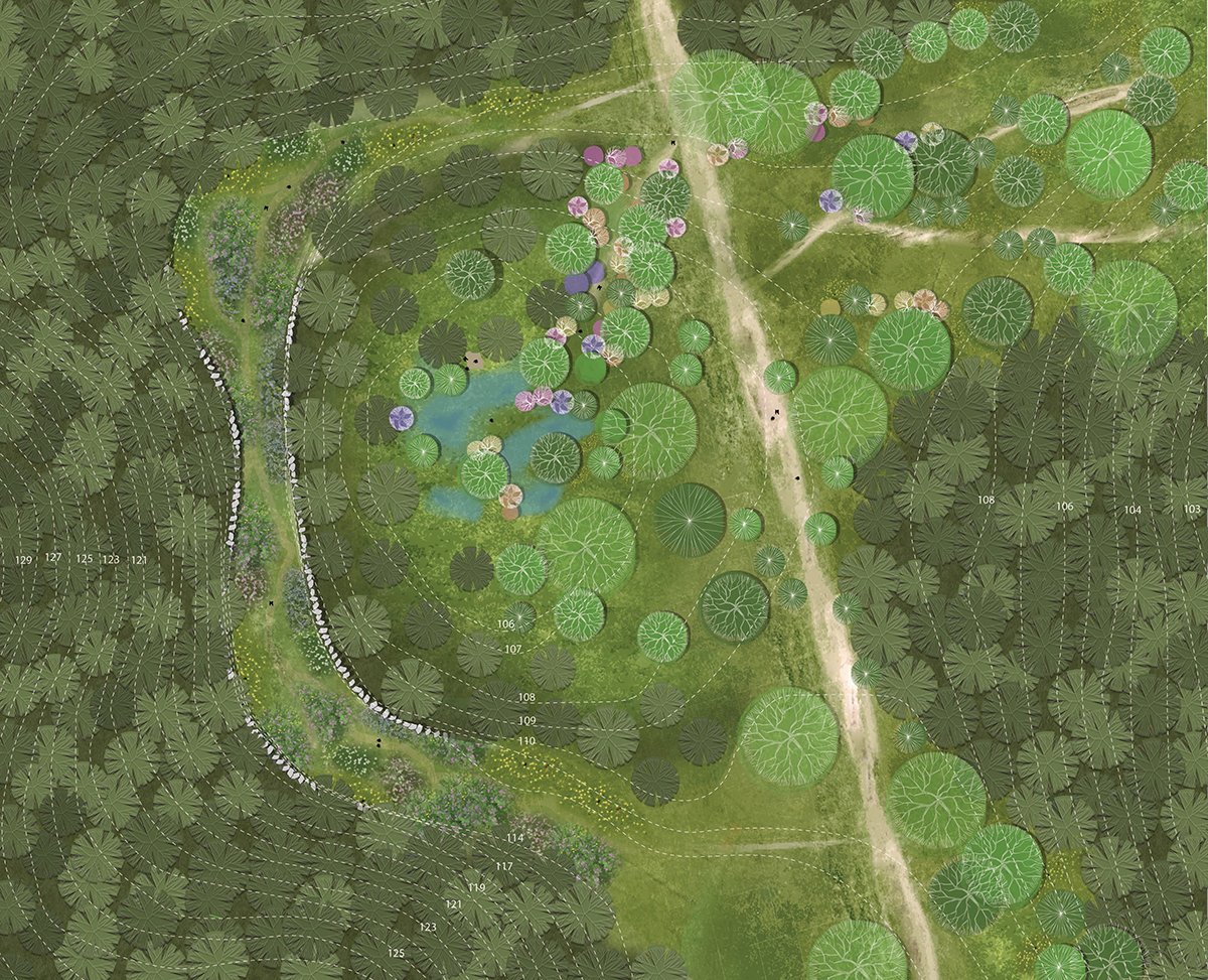 In areas affected by continuous bracken spread, the design seeks to disrupt its dominance using site-specific, holistic strategies — including the introduction of wetlands, controlled planting of rhododendrons, and soil pH modification to encourage a broader range of plant communities. A sustainable management framework for Rhododendron ponticum is also proposed, focusing on maintenance rather than eradication.