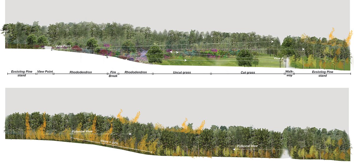 The Ecological Firebreak | The ecological firebreak begins at the visitor center with a Rhododendron garden walkway through the forest.Section through Rhododendron ponticum gardenSelective removal of pine trees to accelerate natural spread of rhododendronThe fire break gradually transforms into a broadleaved forest interspersed with open grasslands and shrubs, creating a diverse ecotone.