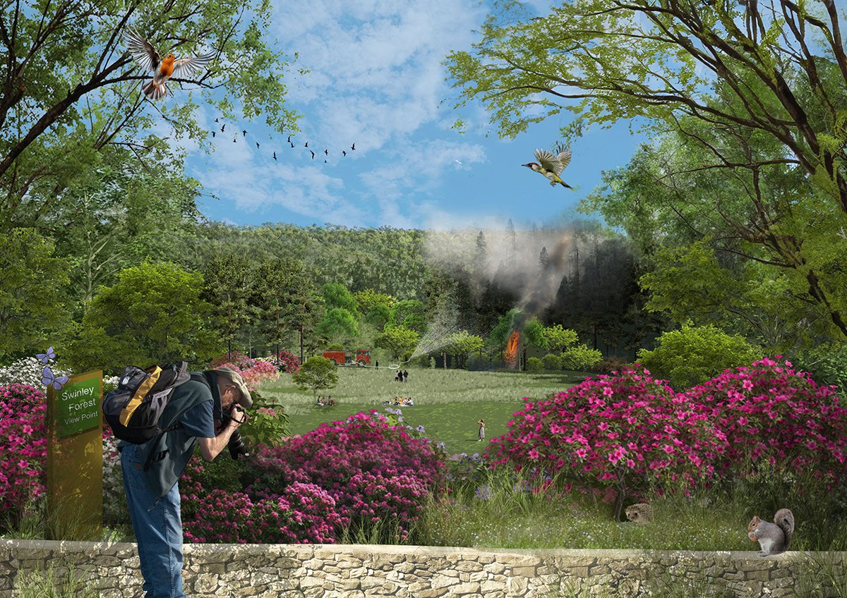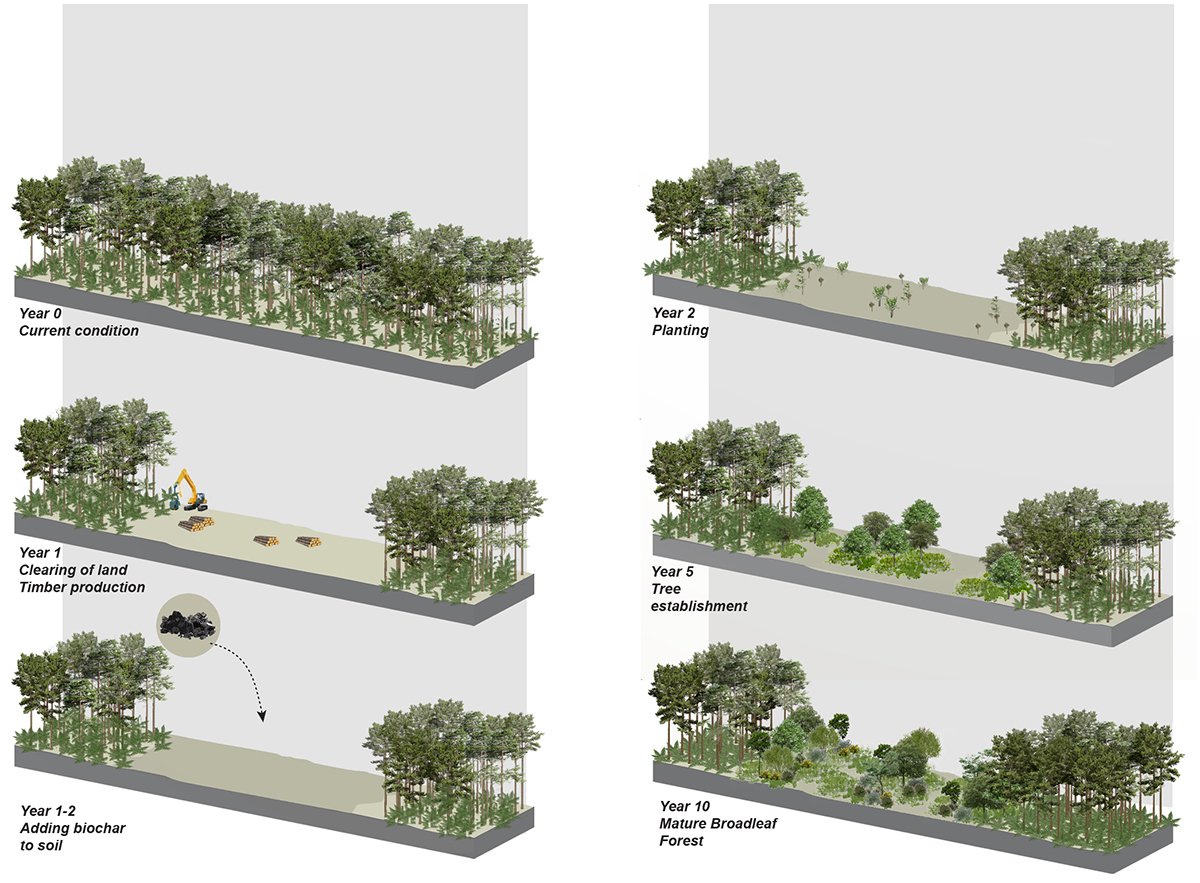 Collectively, the design functions as a continuous ecological corridor that balances invasive species management, fuel reduction, habitat diversification, and visitor experience — preparing Swinley Forest for a changing climate and future wildfire risk.