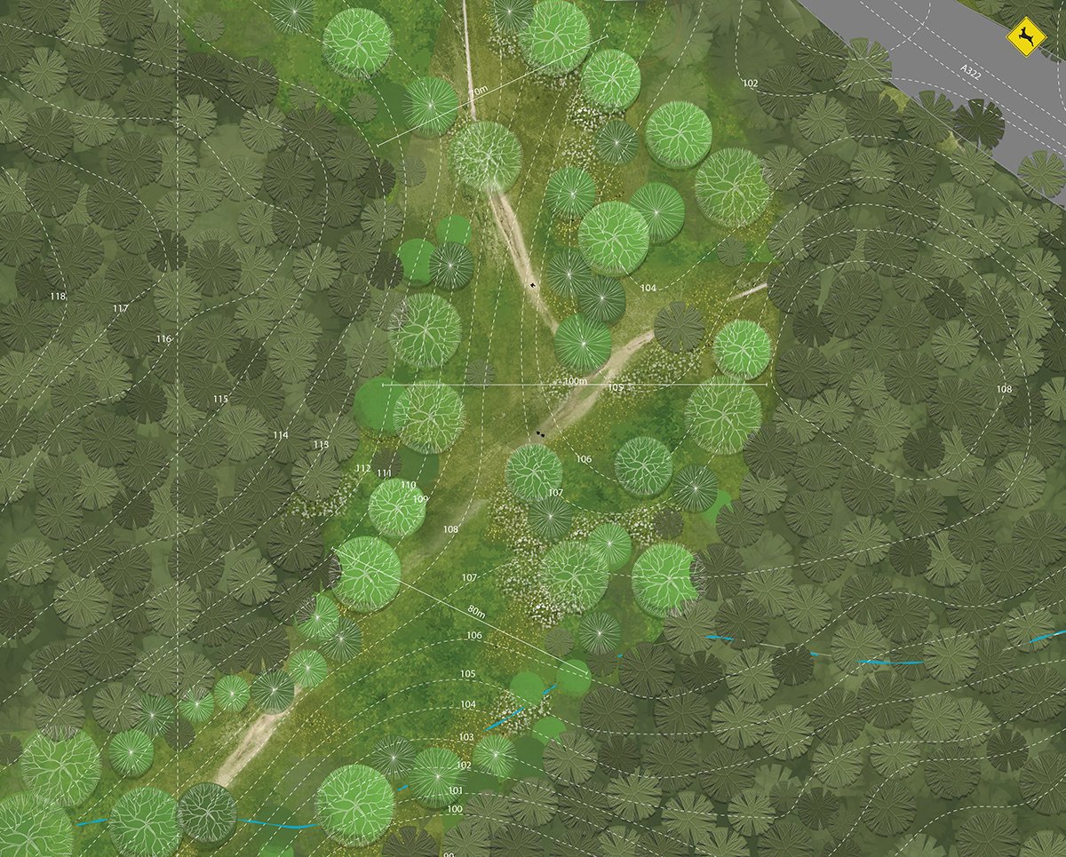 A haven for large mammalsTemporality: Phasing for broadleaved forestThe firebreak leads into a wetland edged by meadowland, linking forest, grassland, and rhododendron garden into a biodiverse ecosystem mosaic.The meadowlands and wetlands limit bracken spread, create new habitats, and resist fire, keeping the steep slope at low risk.