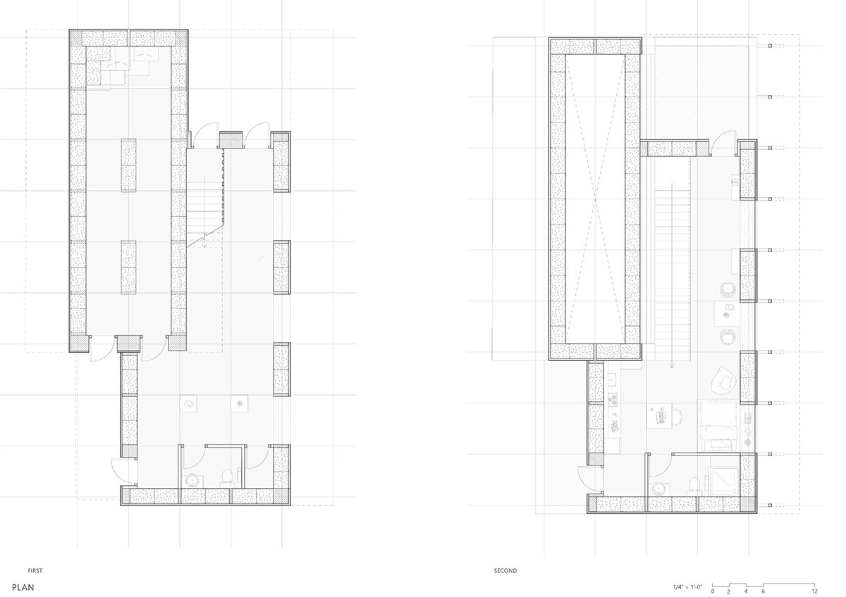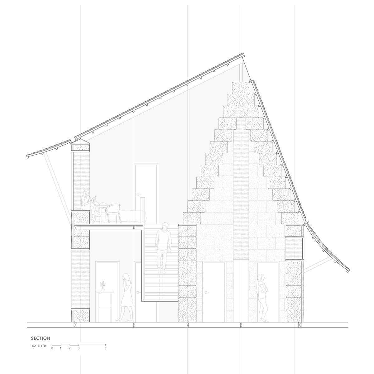 Across all levels, straw bale–specific architectural details are integrated into everyday functions—thick window assemblies provide built-in seating, and exposed bale-stacking patterns become shelving—offering a comprehensive exploration of how the material can support diverse programmatic needs while celebrating sustainable construction practices.