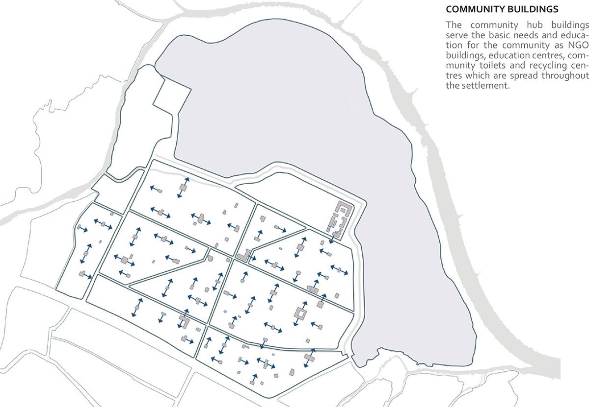 Program Possibilities: The shared facilities can serve a variety of purposes, including workspace (recycling and upcycling centres, co-design lab), non-governmental organisations, assistance centres, community schools, daycare centres, medical clinics, and communal restrooms.