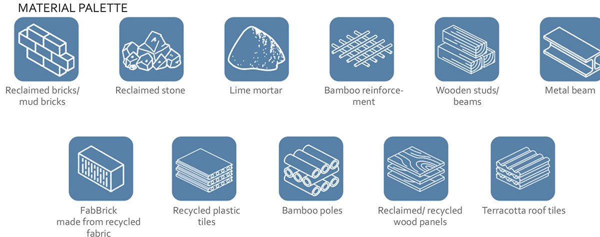 Maintaining the housing units’ material palette, the materials—reclaimed stones from construction waste and recycled/upcycled textiles—are either locally sourced or obtained from the landfill. Due to their affordability, light weight, and flexibility, roof trusses are constructed using a similar metal frame design.