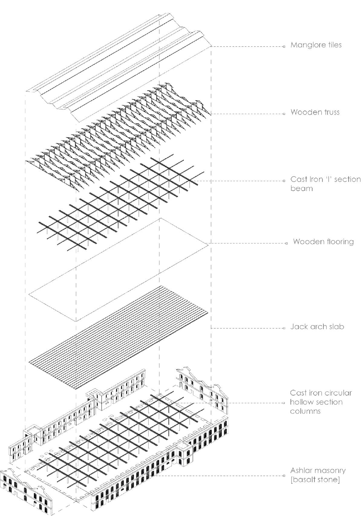 Exploded Isometric of the Structural System and Materiality of the Spinning Block and Documentation of the Existing Spinning Building