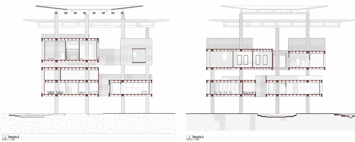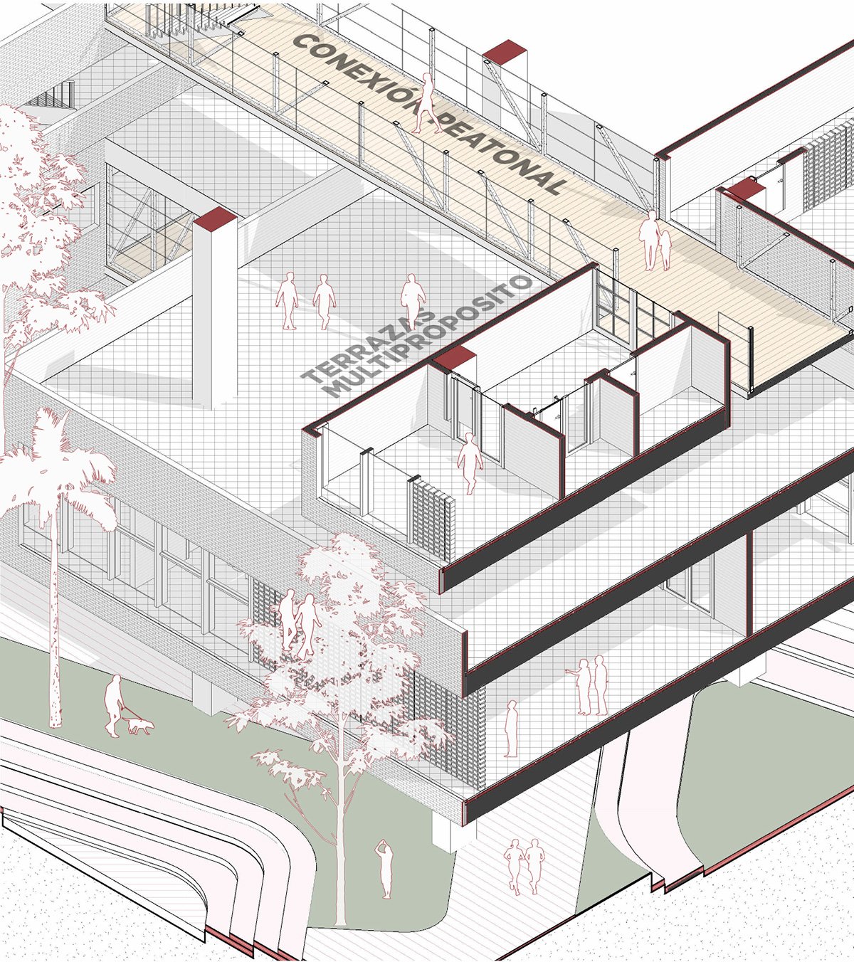 Design and Construction Strategy: To develop this proposal, three main design operations were considered. The first is the elevation of the main volume, which frees up the ground floor and creates a large green platform that directly connects the neighborhood with the park. The second is fragmentation: the suspended volume is strategically divided to generate voids and interstices through which nature filters, integrating with the building and promoting ventilation, natural light, and cross-views.