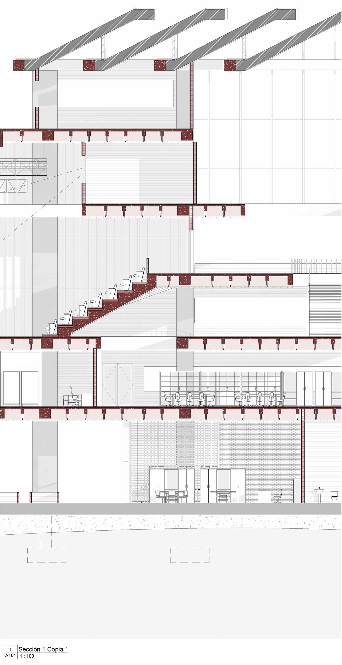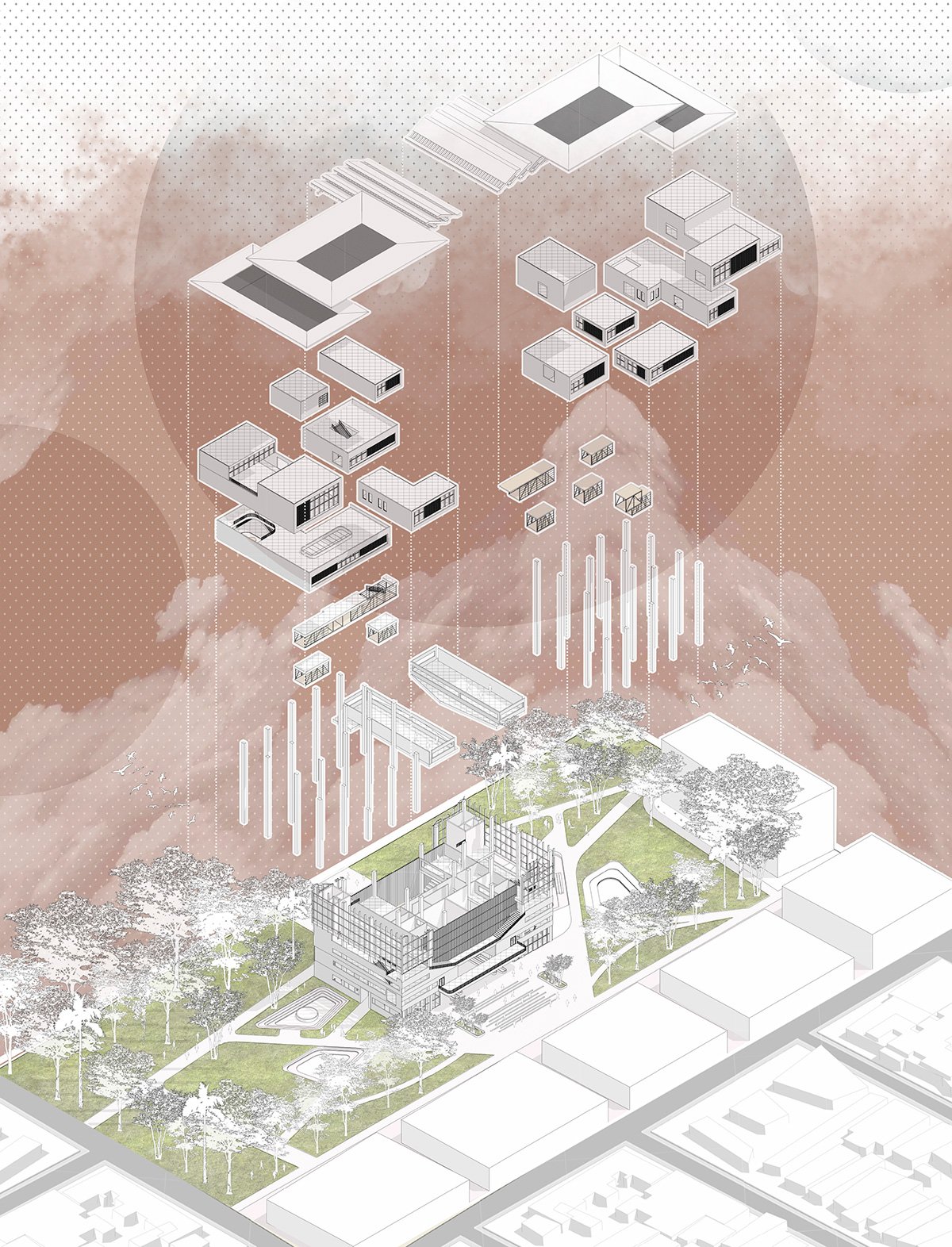 Introduction: This project stems from three fundamental strategies defined in the park’s master plan. The first is to integrate the park with its immediate context through programmatic corridors that directly connect the city with the park’s ecological system. The second is to limit human intervention to allow nature to reclaim its space, using controlled biophilic pathways that protect animal habitats. And the third is to revitalize the green space by implementing nature-based solutions that help regenerate the park. Based on these strategies, the Fine Arts Building emerges. This building is conceived as a cluster of programmatic containers that integrate nature, art, and community. The volumetric proposal is based on modules suspended and articulated with each other by lightweight structural cores, allowing us to create a clear relationship between mass and void, fluid circulation, and open views that connect with the surrounding environment.