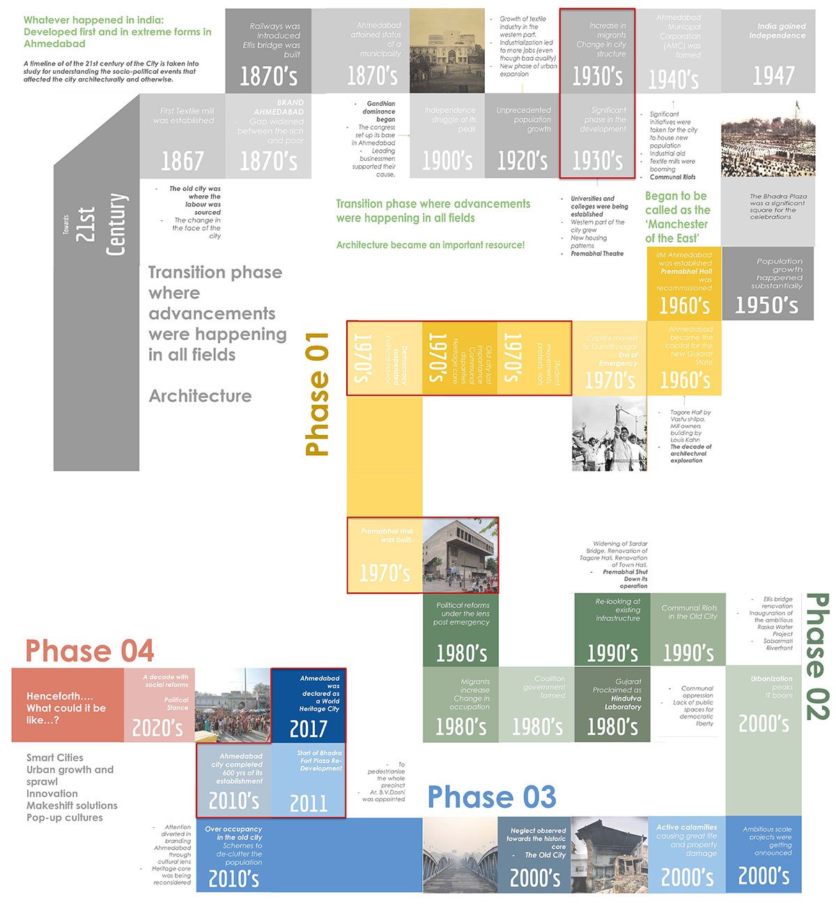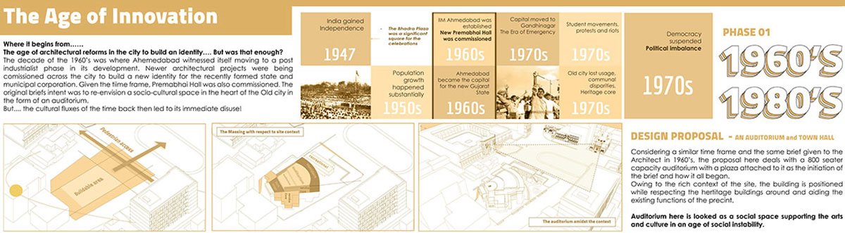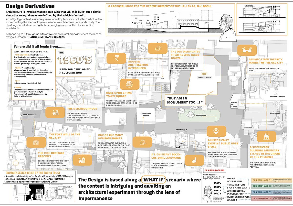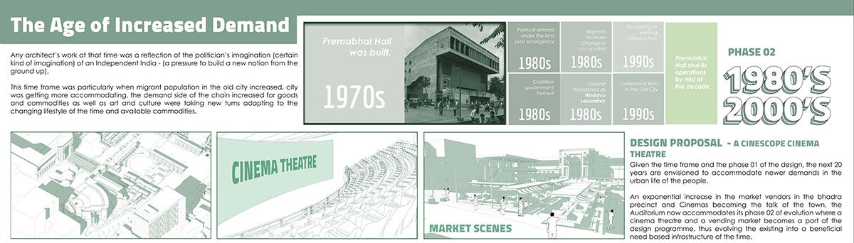 The connection towards the design ideation processThe Case of Premabhai Hall is considered as a mere hypothetical understanding for the thesis idea to be implemented as an alternative approach in such a dynamic context of the old city of Ahmedabad – The Bhadra Plaza. An alternate approach of design in which the building’s life is mapped using several possible cultural shifts that are observed and interventions that are planned as responses to help the building remain relevant rather than become obsolete on occasion.