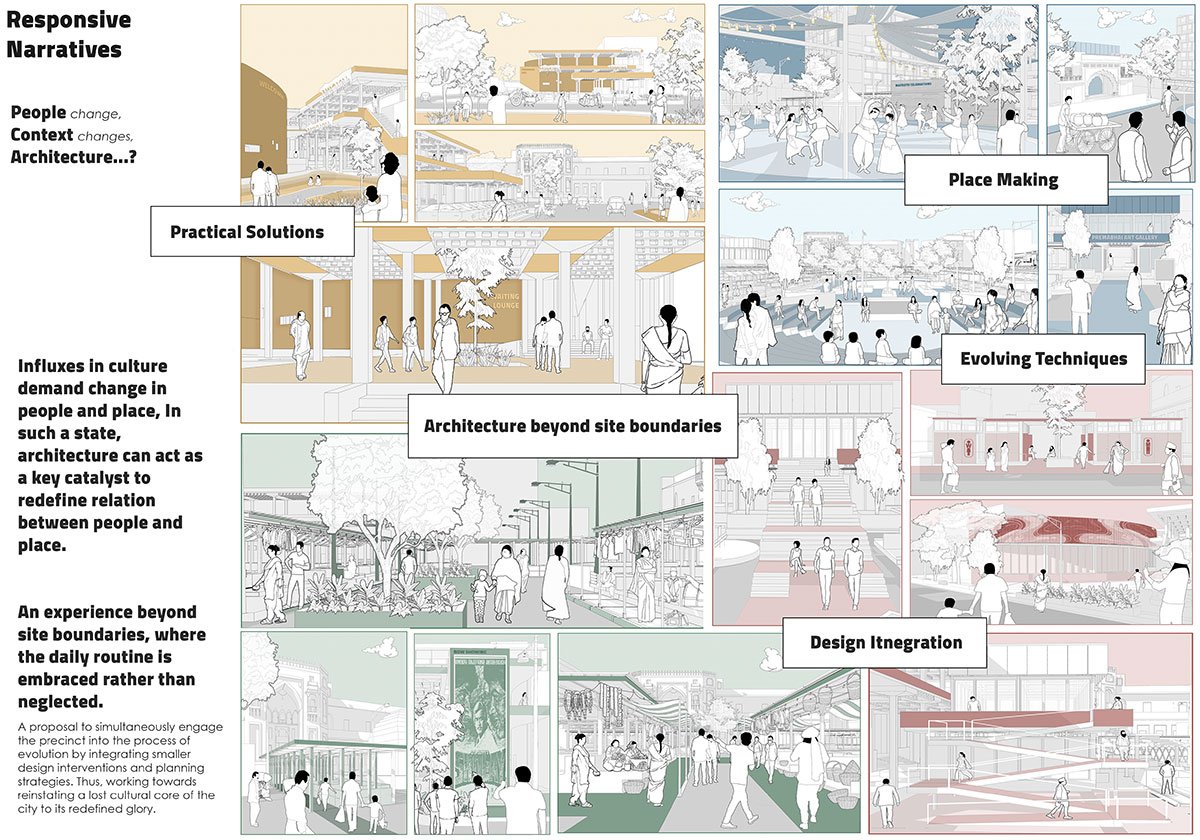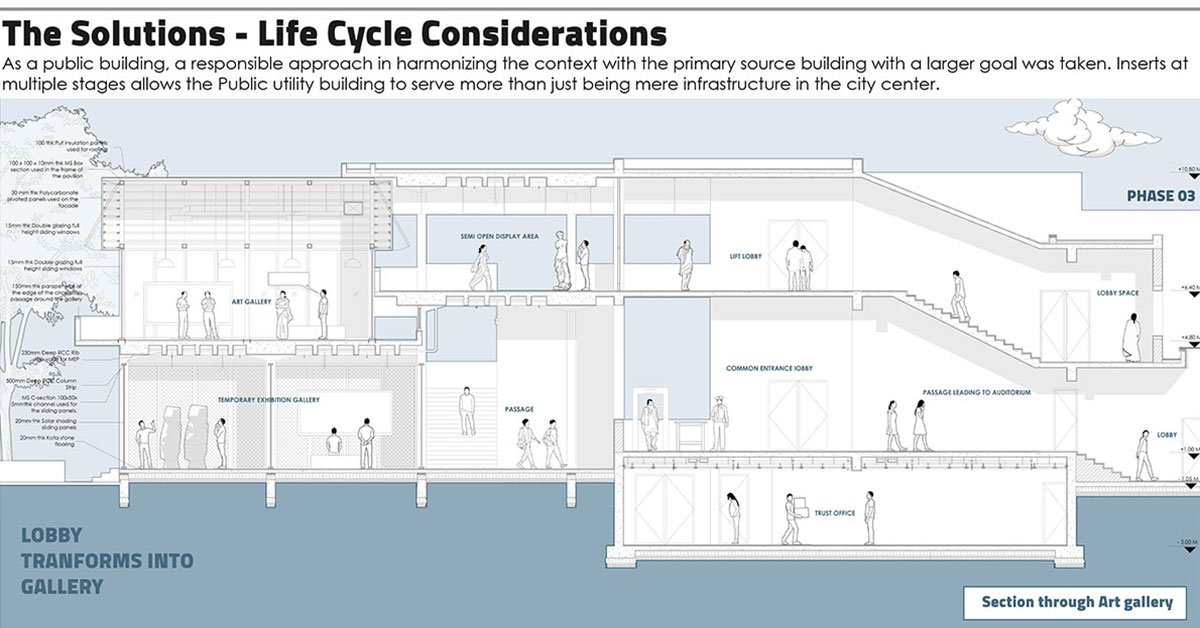 Spatial narrative with essential interventions through time and space in each phaseThis allowed a better understanding of the change that accompanied a built form while questioning its relevance from time to time. The proposed interventions are a response to ensure the building’s continued relevance and ability to withstand evolving times and demands. The overall built form is made more responsive and adaptable by strategically applying primary construction techniques with a futuristic understanding of the changes that it may undergo.