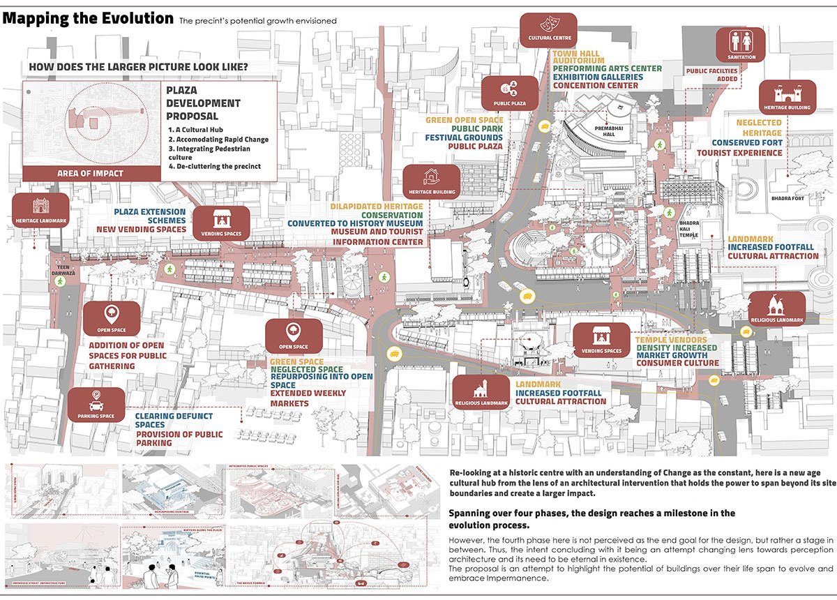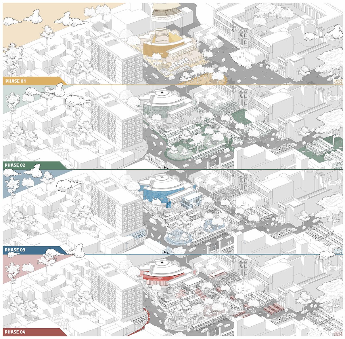 A site plan envisioned the development of the plaza after the four phases of proposed development.Conclusion: The project uses Premabhai Hall as a model to explore the impermanence and conceptual evolution of ideas. Viewing buildings as beings responding to change and changelessness, the project showcases an alternate design approach that maps the building’s life using cultural shifts and proposes interventions to maintain relevance.