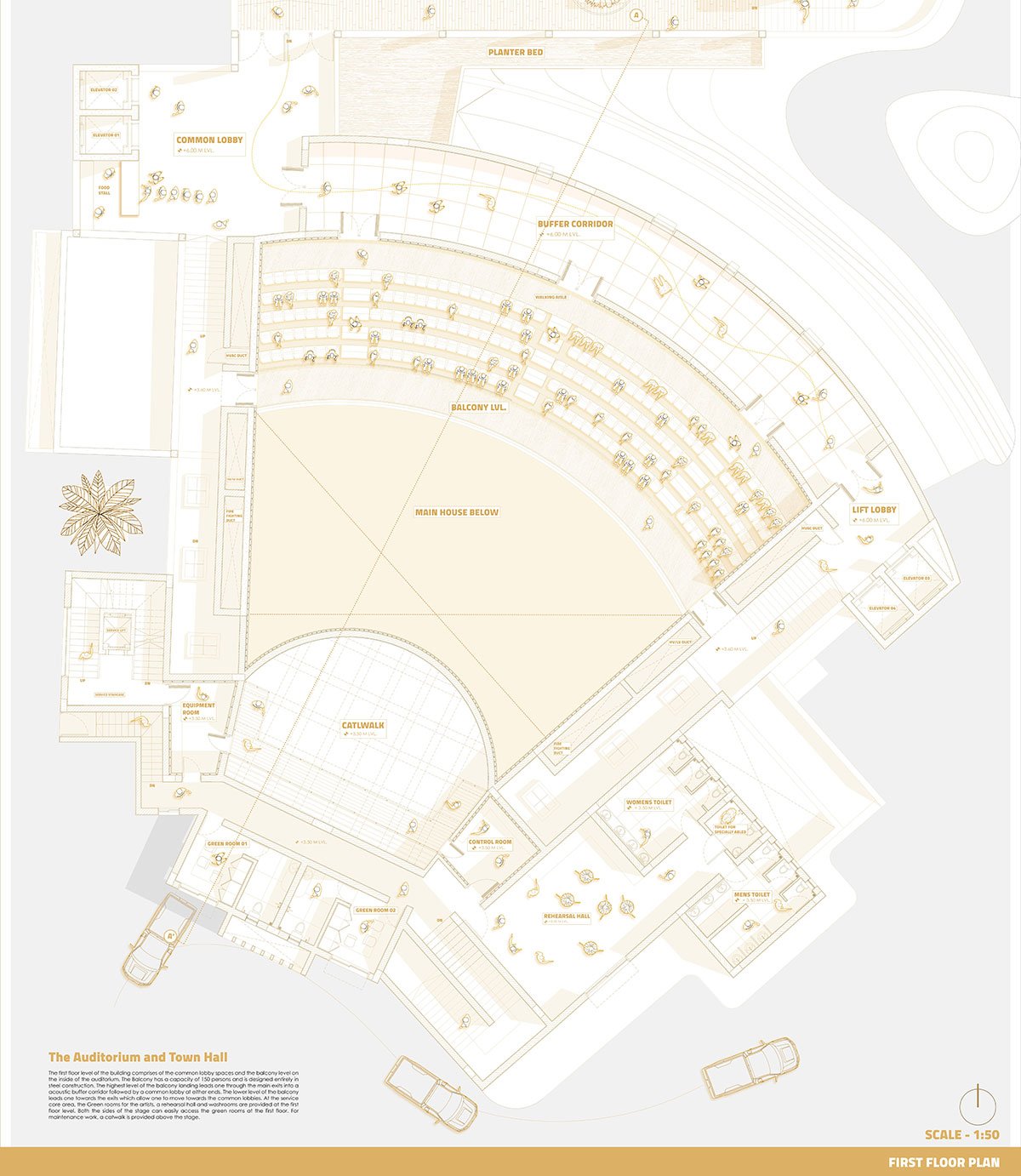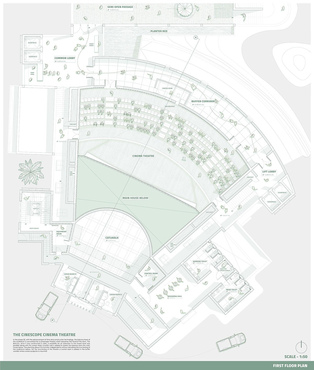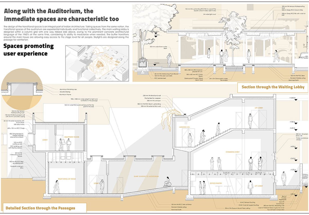 Phase 01: Ground floor plan – The Auditorium Block | Phase 01: First Floor Plan – The Balcony LevelArchitectural Details associated with each phase that allow adaptability and transformationPhase 01: Site SectionsConsidering a similar time frame and the same brief given to the Architect in 1960’s, the proposal here deals with a 800 seater capacity auditorium with a plaza attached to it as the initiation of the brief and how it all began. Owing to the rich context of the site, the building is positioned while respecting the heritage buildings around and aiding the existing functions of the precinct. Auditorium here is looked at as a social space supporting the arts and culture in an age of social instability.