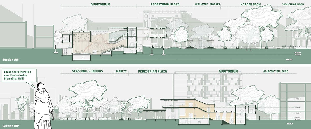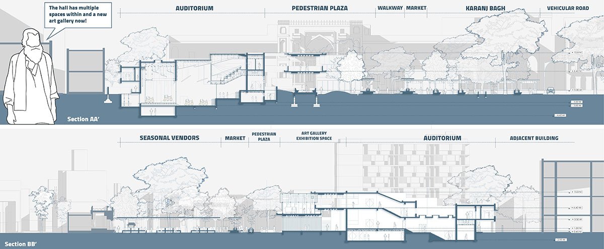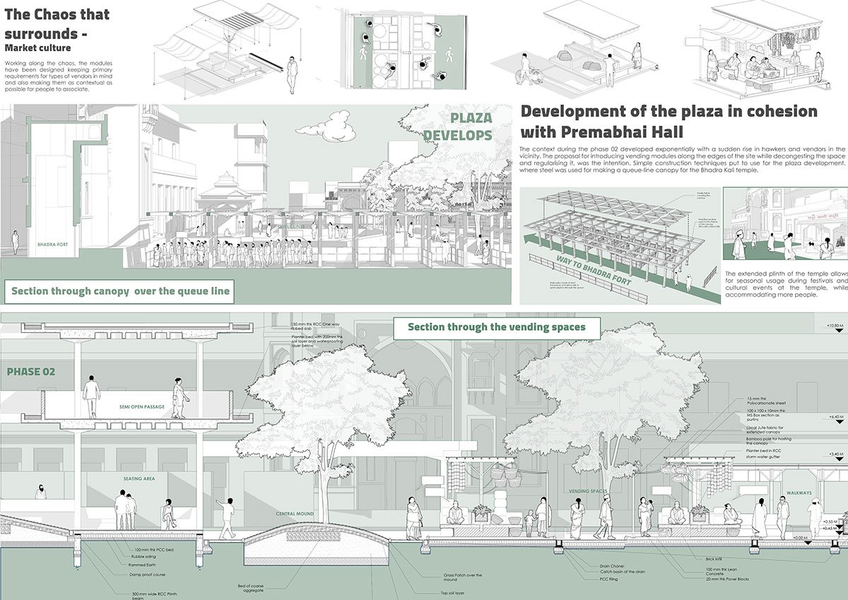 Phase 02: Site SectionsArchitectural Details associated with each phase that allow adaptability and transformationGiven the time frame and the phase 01 of the design, the next 20 years are envisioned to accommodate newer demands in the urban life of the people. An exponential increase in the market vendors in the Bhadra precinct and Cinemas becoming the talk of the town, the Auditorium now accommodates its phase 02 of evolution where a cinema theatre and a vending market becomes a part of the design programme, thus evolving the existing into a beneficial need based infrastructure of the time.