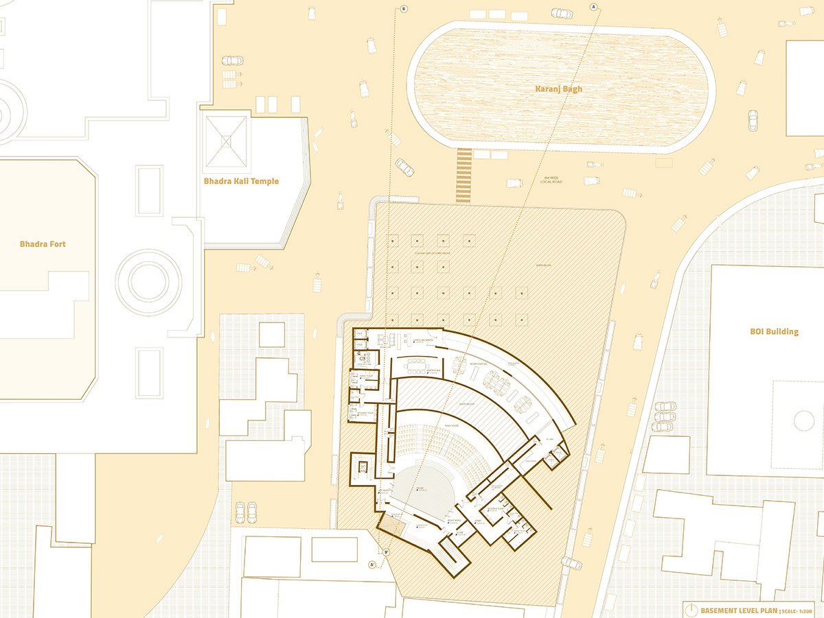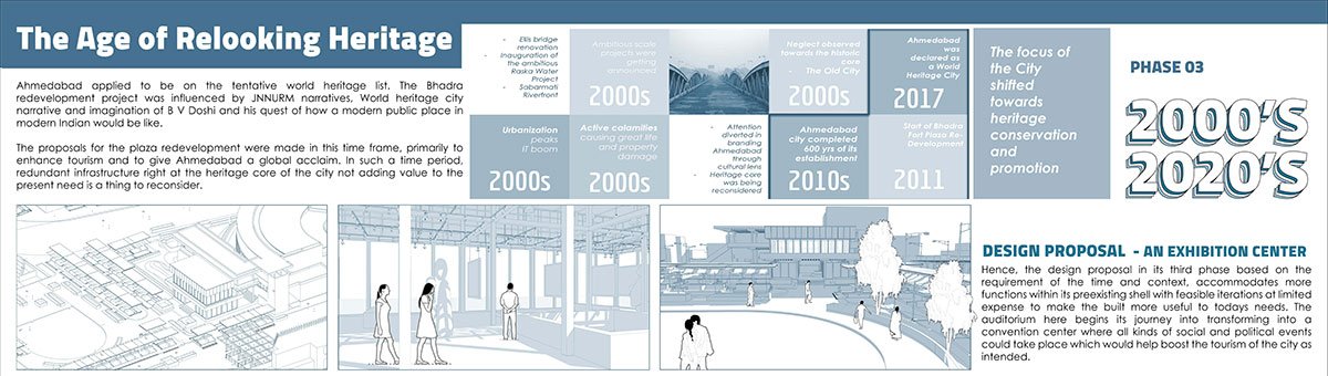 Phase 03Phase 03: Site Plan through the third phase of the proposal – Context embraces the vision of Heritage CityAhmedabad applied to be on the tentative world heritage list. The Bhadra redevelopment project was influenced by JNNURM narratives, World heritage city narrative and imagination of B V Doshi and his quest of what a modern public place in modern India would be like. The proposals for the plaza redevelopment were made in this time frame, primarily to enhance tourism and to give Ahmedabad global acclaim. In such a time period, redundant infrastructure right at the heritage core of the city not adding value to the present need is a thing to reconsider.