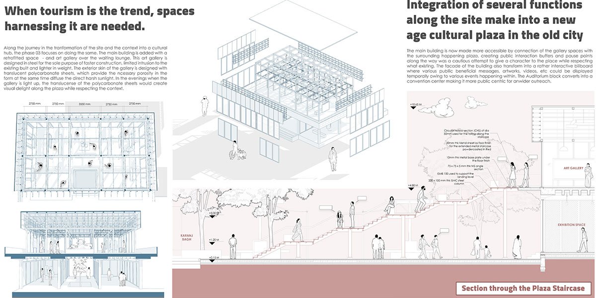 Phase 04: Site SectionsArchitectural Details associated with each phase that allow adaptability and transformationThe auditorium here starts operating like a convention center in the old city providing mutiple spaces for several events, programs, meets to take place at the same time, integrating the precinct as a plaza for the visitors and the locals proving a holisting experience. The plaza here embraces the chaos of the existing and works along with it to make it a more tangible goal.