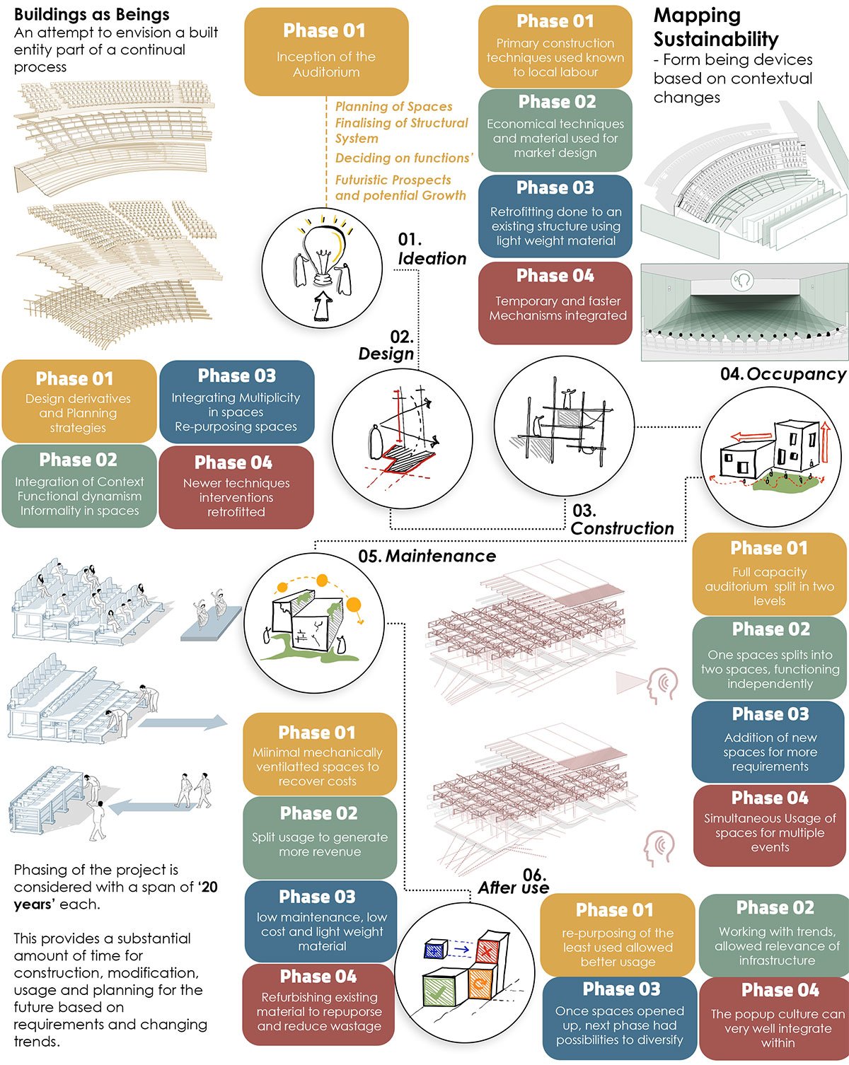 Each phase enables different aspects of the architecture along with the immediate surroundings, thus creating a larger impact.Therefore, to reconsider the proposal at the same site, using the auditorium’s similar design brief from the era when the hall was first constructed in the 1960s, the design programme is envisioned as an alternative design approach where the building’s life—an auditorium, in this case—is mapped through a series of possible events while taking cues from the context’s timeline and framing it in the form of a storyline method.