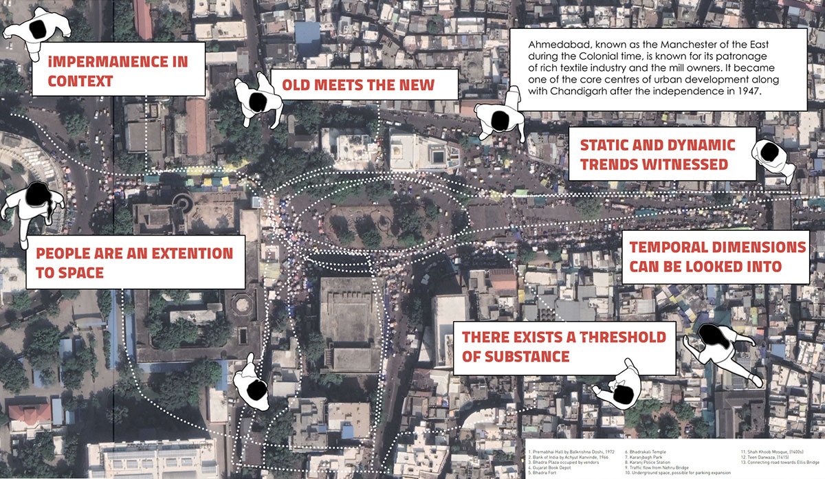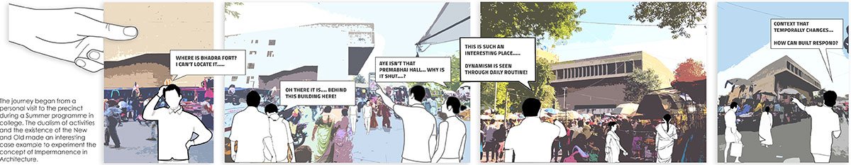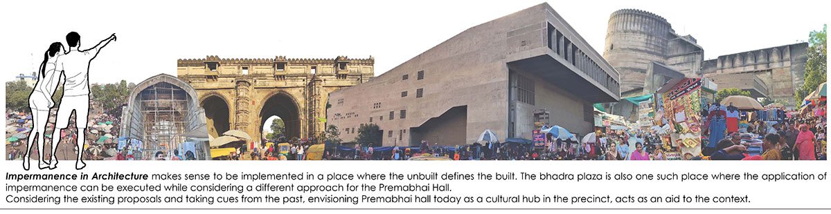 The case of Premabhai Hall – A montage depicting the Character of the Bhadra Fort PrecinctA first-hand experience with the site led to raising several questionsBased on the findings of the thesis, the concept of impermanence in architecture was to be experimented within places where the transient threshold is evident. A site that is entirely subject to the changing fluxes, situated in a contemporary urban setting that contrasts the old and the new. Such a concept must be put into practice immediately.