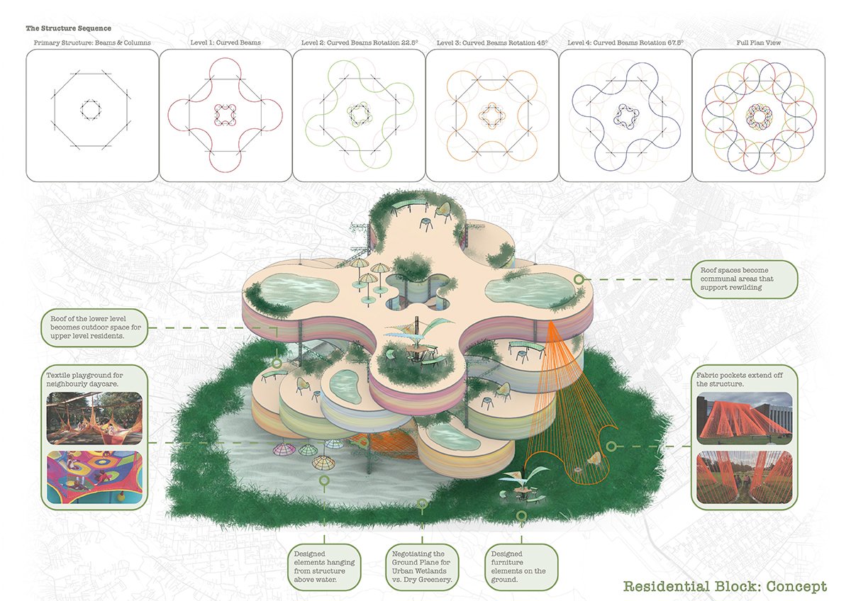 The proposed building reimagines this waste as a resource, serving as both a model and innovation lab for future community construction. At the heart of the proposal is a craftivist centre, a communal infrastructure that houses workshops, studios, and residencies for artisans and their families. The ground floor supports waste processing and design experimentation, while upper-level residential units rethink vertical living to sustain the sociality and infrastructures of care embedded in informal settlements. Urban wetlands are integrated as shared ecological spaces, supporting rewilding and community gathering.
