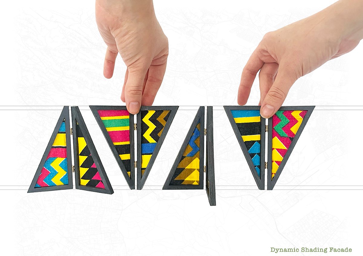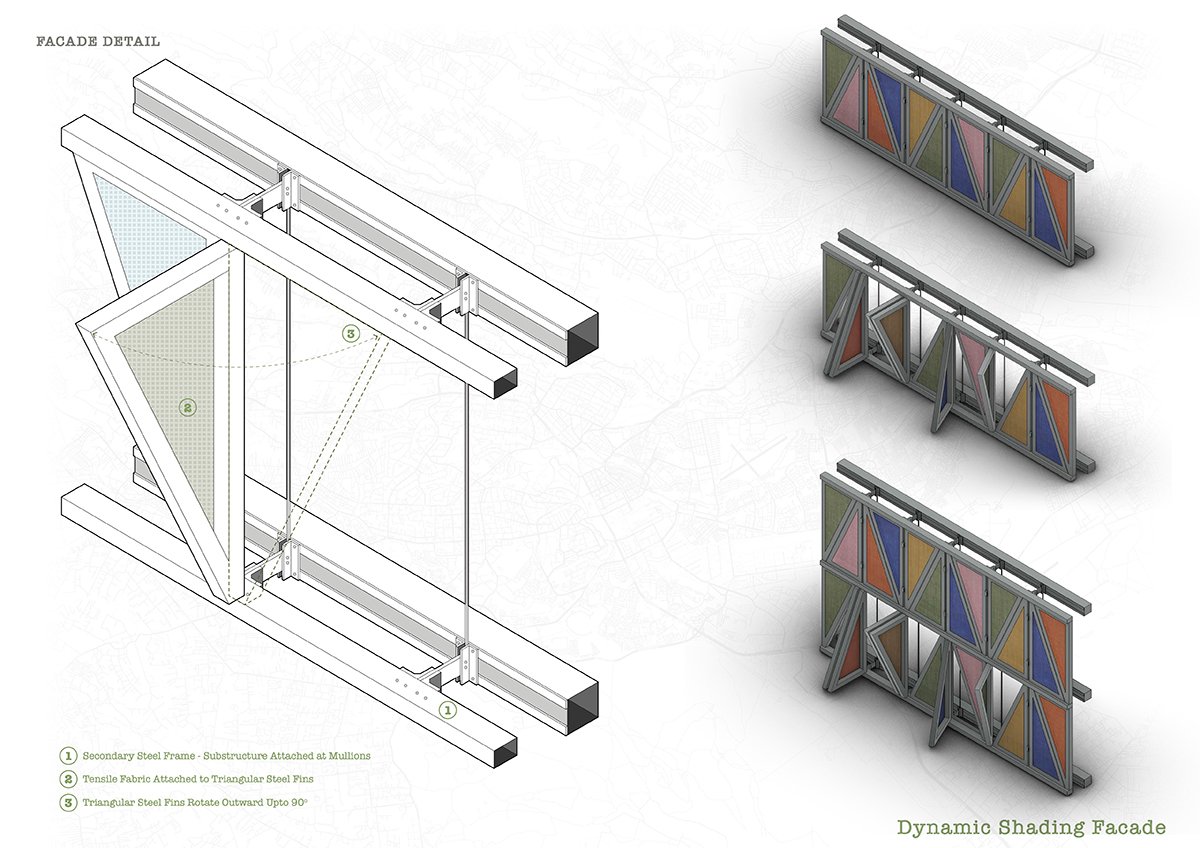 Adaptive Textile Facades: The last façade designed is a fabric woven façade, where textiles wrap around a simple structure, allowing for basic shading.