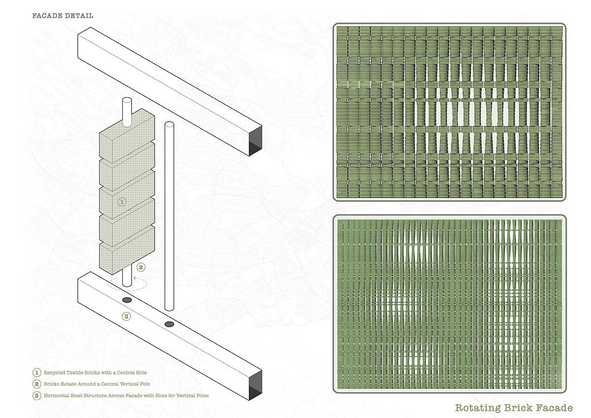 Adaptive Textile Facades: This façade system is a series of fabric bricks rotating on a vertical pole, allowing users to determine the extent to which the façade opens or closes for optional insulation or ventilation and views to the exterior.