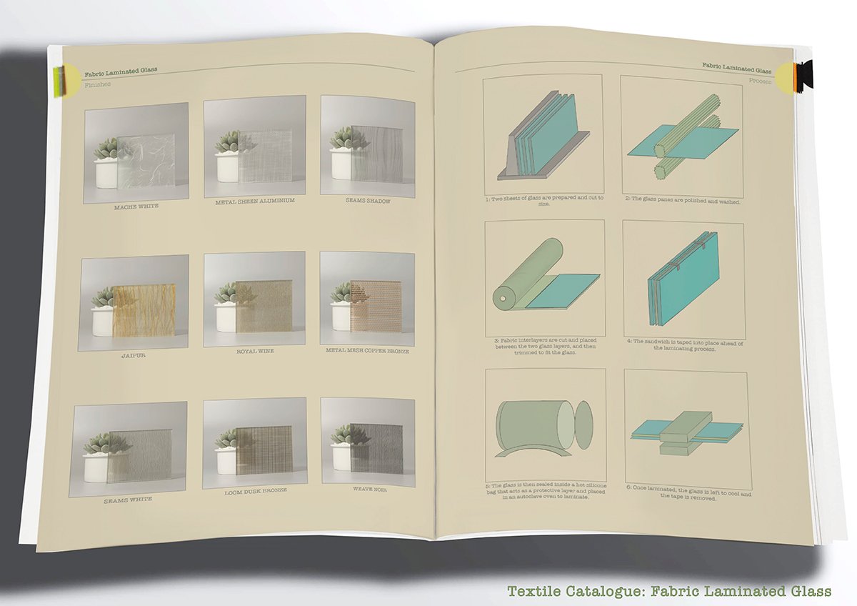 Construction Detail: Individual fabric laminated glass blocks are combined to create a mosaic-type wall, where each block is unique to the fabric and patterns interwoven into the glass, allowing for the play of refractive light into internal spaces. | Construction Detail: Fabric-casting formwork was tested for the construction of the roofs, where the forms are organic and designed such that the edges extend upwards and overhang to provide shading on all sides.