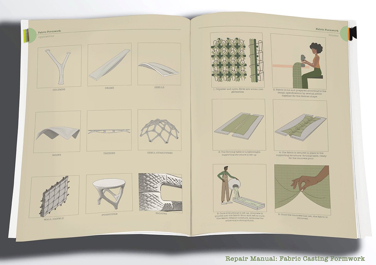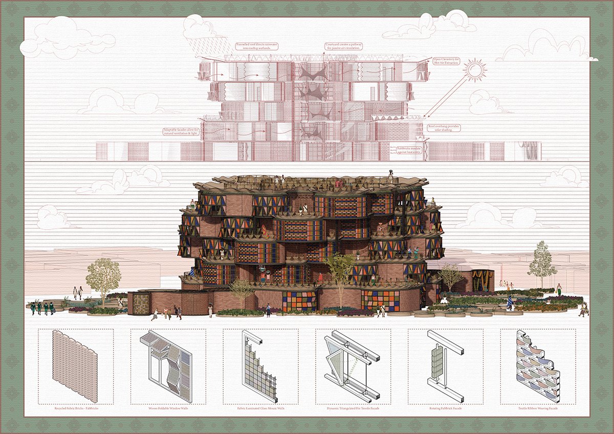 The design process reimagines waste and care as central to architecture. On the ground floor, the craftivist centre integrates waste sorting and workshops, transforming textile waste into building materials. Techniques explored include textile-ceramic “fab-bricks” for walls, rewoven foldable windows, fabric-laminated glass mosaics, and fabric-cast roofing with clerestory ventilation.