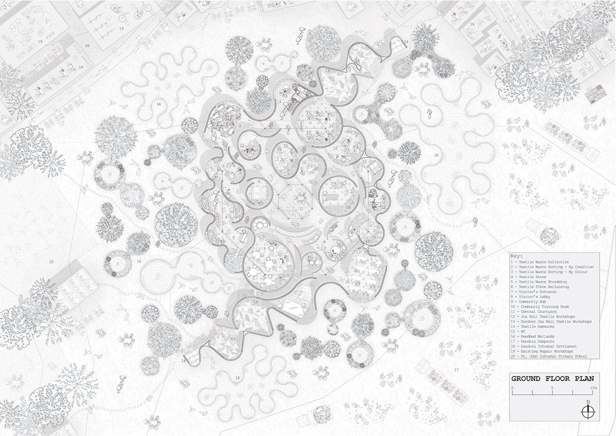 The ground floor offers spaces for this sorting and reclamation process, as well as adaptable studio and workshop spaces for invited informal artisans to innovate in repurposing textile waste for future community construction, illustrating the circular economies embedded in the building and rewilding process.