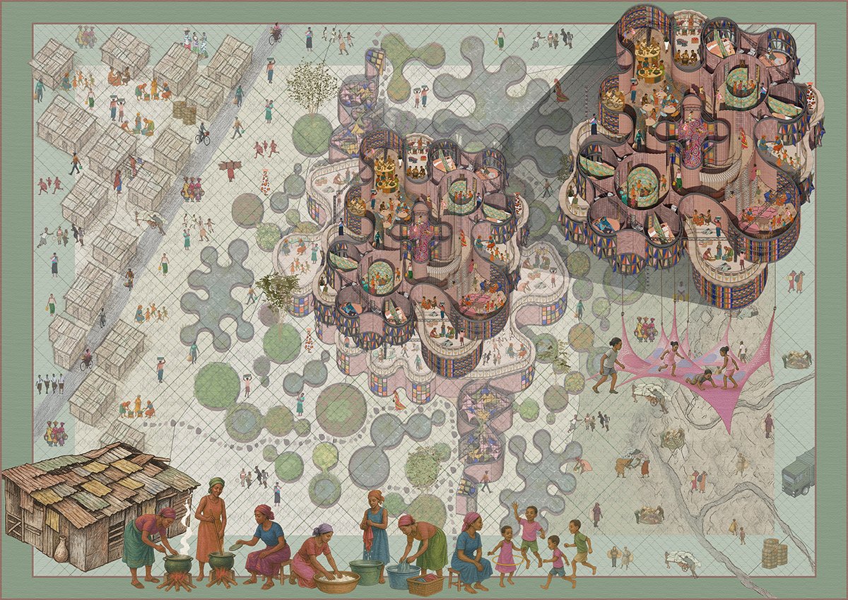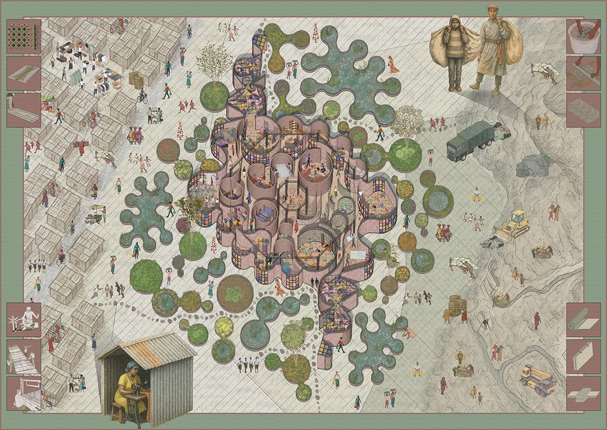 At the heart of the proposal is a craftivist centre, housing workshops, studios, and residencies for the informal artisans and their families; in service to the wider community, the project aims to provide spaces for these artisans to experiment and invent new building systems from repurposed textile waste, initiating a new form of slum upgrading where residents become active participants in reshaping the city from its margins.