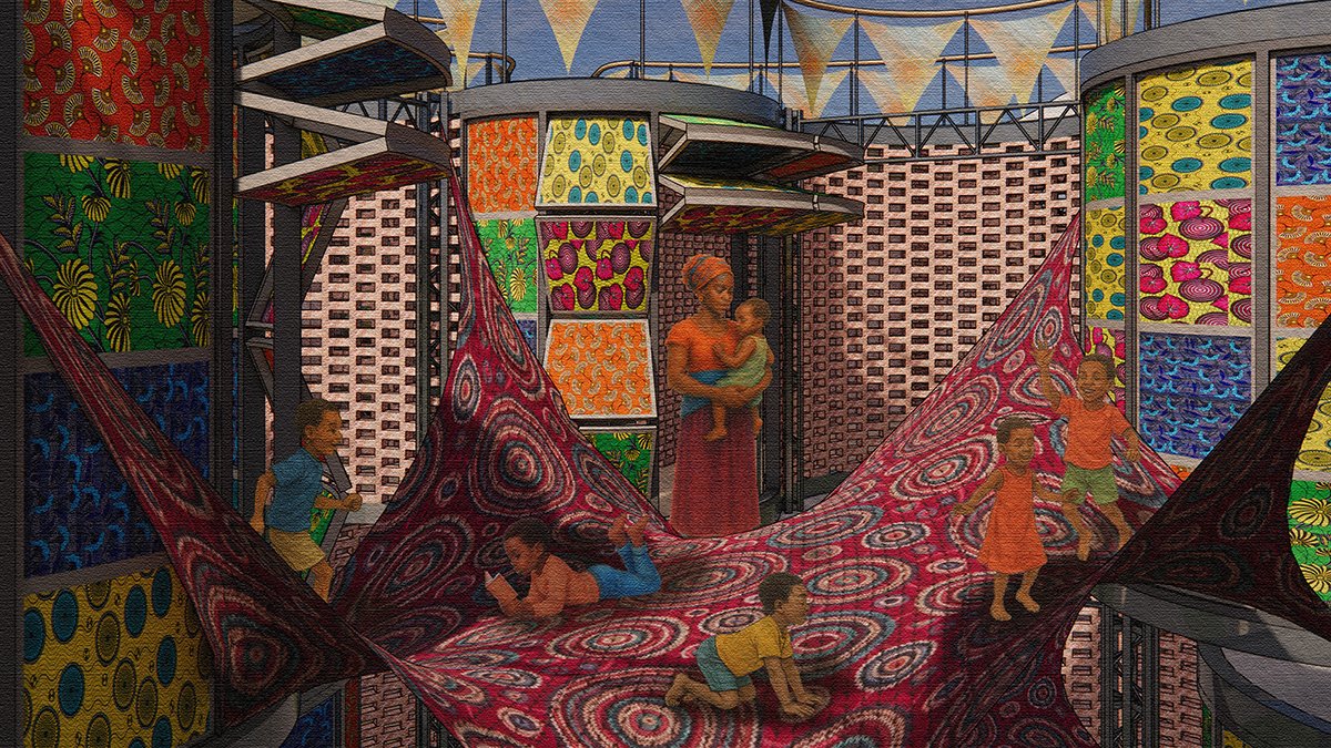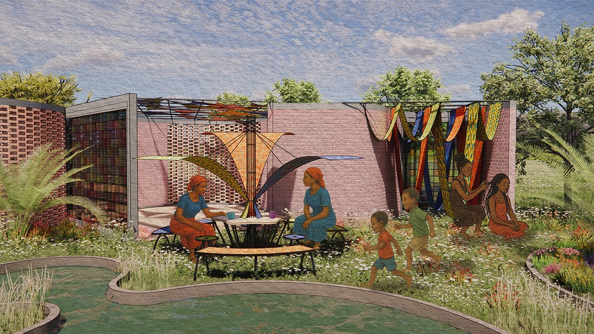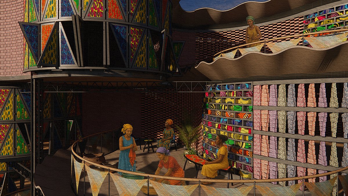 The overall building design draws inspiration from Kenyan Kanga textiles, with vibrant floral motifs and patterns informing façades and flooring, embedding cultural identity into a model of sustainable, community-led architecture.