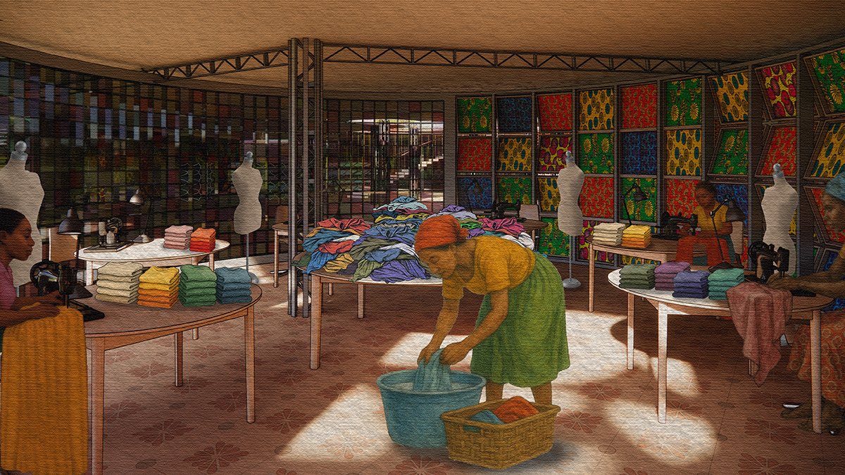 These material systems enhance insulation, adaptability, and vibrancy while embedding colour and light into spaces. Textile waste is sorted, shredded, and repurposed into construction elements or repaired for resale, reflecting existing repair practices in Nairobi’s informal settlements and proposing an alternative to throwaway culture.