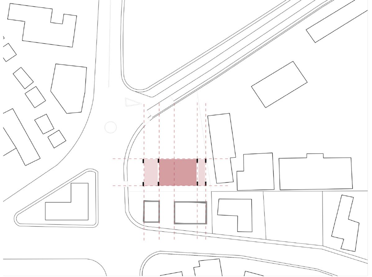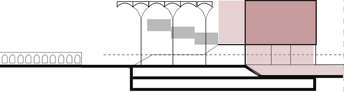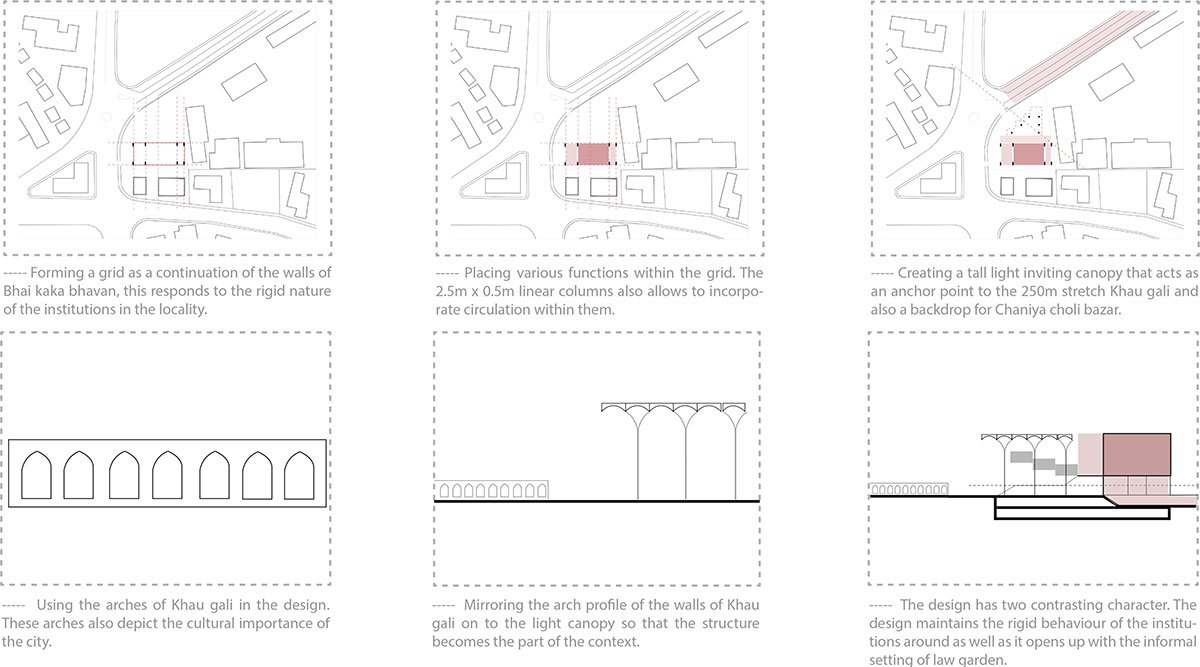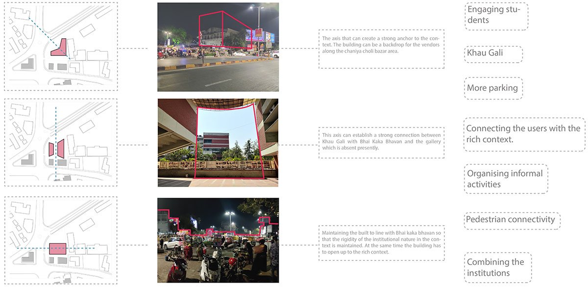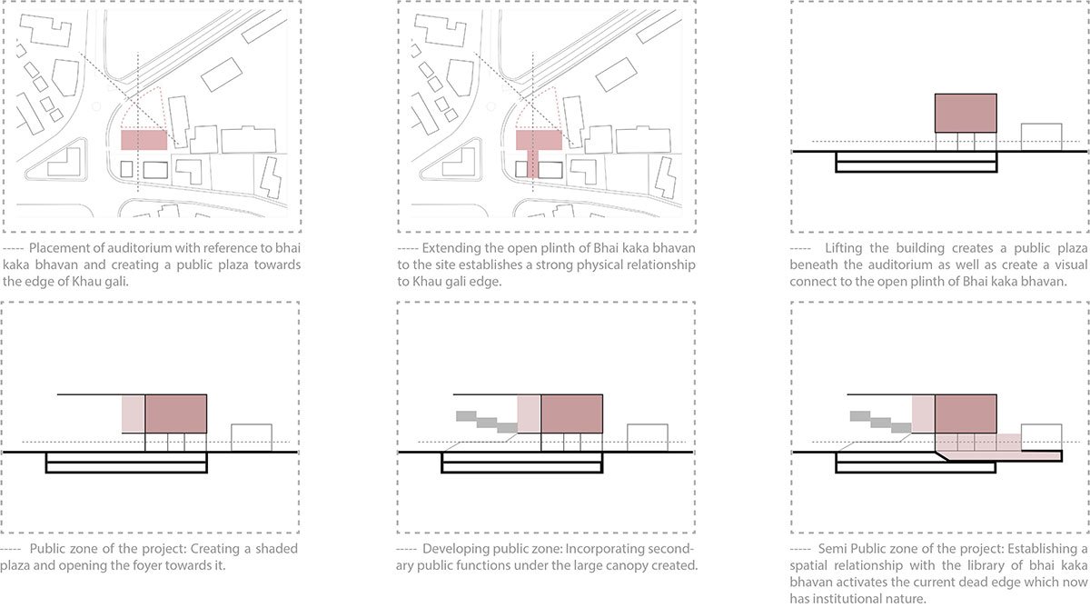 3. Combining the institution: To achieve smooth pedestrian movement, the plaza and canopy are aligned with Bhai Kaka Bhavan, also addressing the potential for a public intervention to enhance its surroundings.