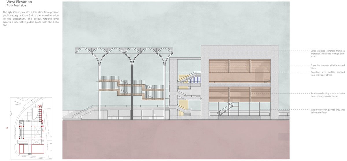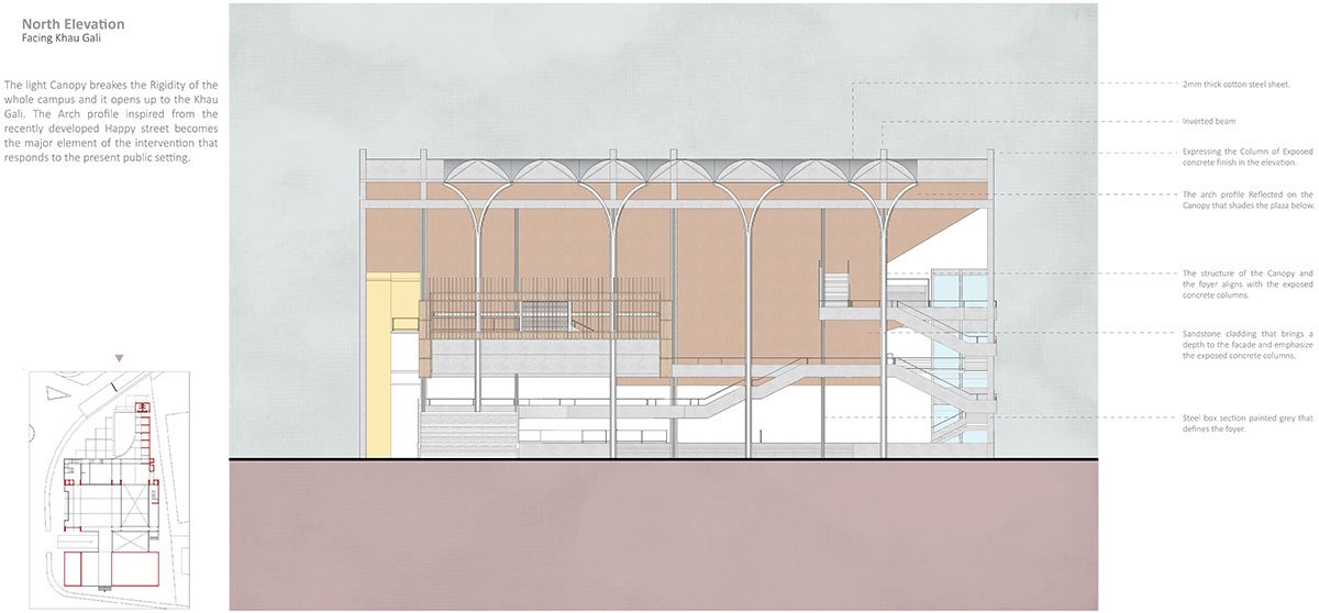 2. Building acting as an anchor: To create an anchor point for Khau gali, a tall and slender canopy is incorporated over the pedestrian plaza. The arch profile on the walls of Khau gali that reflects the city’s cultural significance is mirrored to the canopy to keep the structure a part of the context.