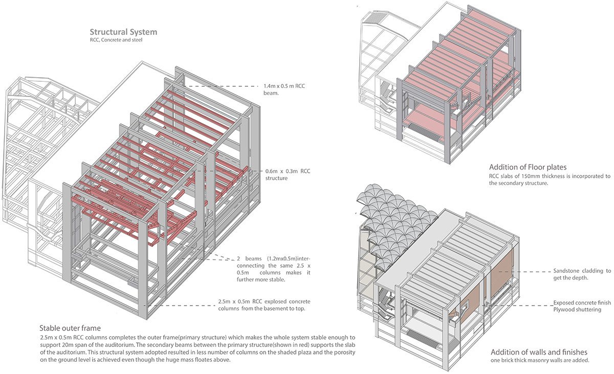 Structure:The structural system consists of large twin columns to reduce the grid formed on the shaded plaza under the auditorium and create a visual connection with its immediate setting. The rigid approach and the informal behaviour of the intervention go hand in hand. It respects the privacy of the performance space and the visual and physical connectivity are maintained in the buffer space between these two contrasting features.