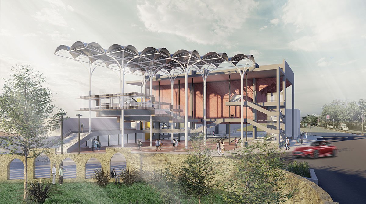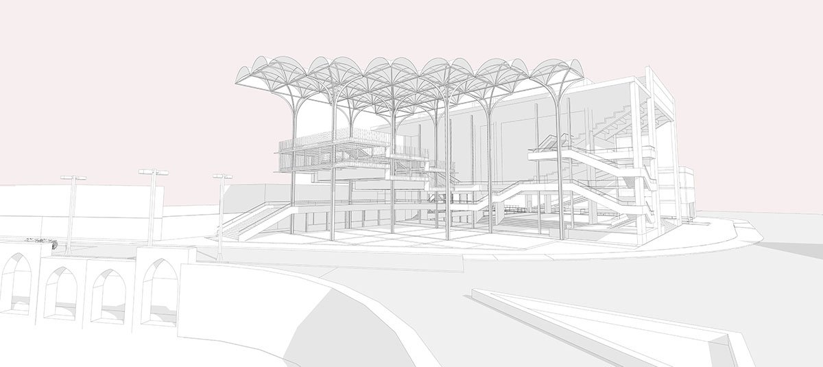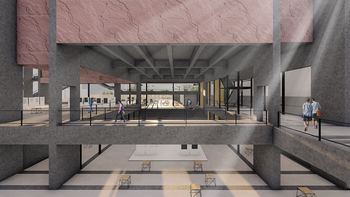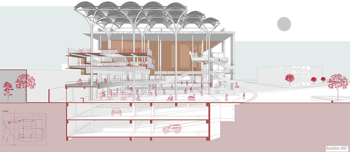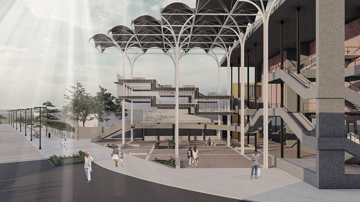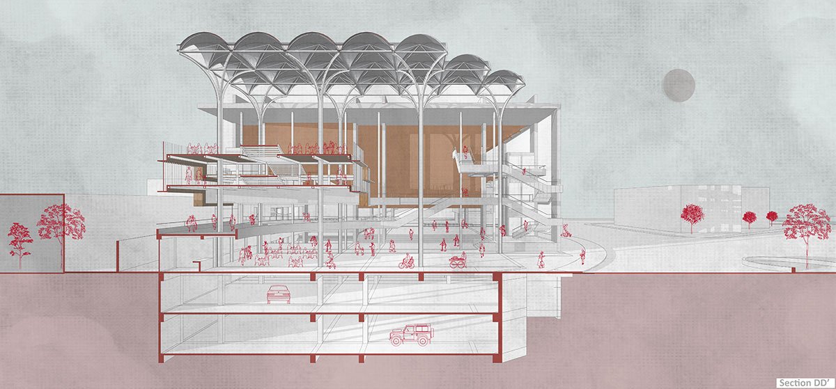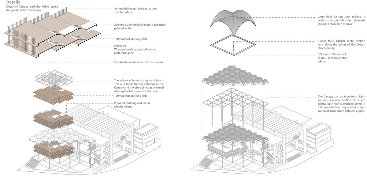 Materiality: Mild Steel sections are used as structural elements as the 18m tall canopy needed an inviting nature as well as less columns on the ground. In order to give the main component of the intervention a rigid personality, spaces like the auditorium are made of exposed brick, and the structure becomes form-finished concrete, blended in with the region’s material palette.