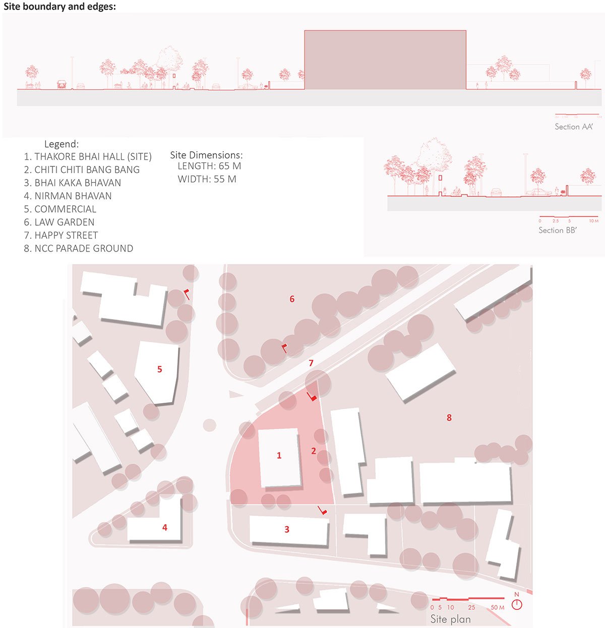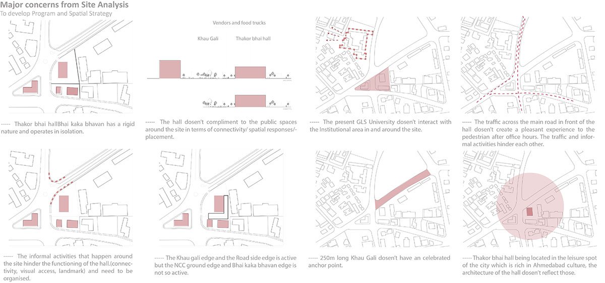 The site analysis aided in developing the program and spatial strategy and highlighted some concerns. One of the main issues was that the hall’s architecture failed to reflect Ahmedabad’s rich culture. Other issues included the institutes’ rigid nature, the lack of interaction between the institutes, the difficulty of getting about the hall owing to traffic and informal activities, and their lack of response to public spaces.
