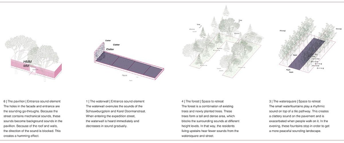 Design elements: The new calm soundscape is built up by a set of sound elements that create two categories: A. the transition from the louder environment to the ensemble and B. the transition between several spaces to retreat within the ensemble. Below, some of the elements that are part of the design, are shown.