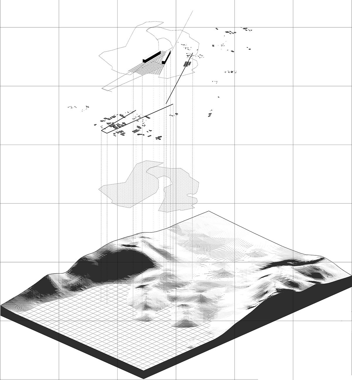 The two proposed structures seek to respond to the scale of the surrounding earth and its internal variations through patterns of recognition of the existing terrain. They embody a logic of complete void by attempting to extend the boundary, and the structures that emerge are the absolute totality that is shaped and influenced by the things they come into contact with. Every subsystem of the analysis exists and develops as a latent microcosm within the solid volumes.