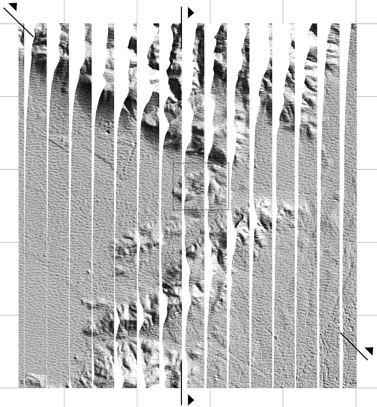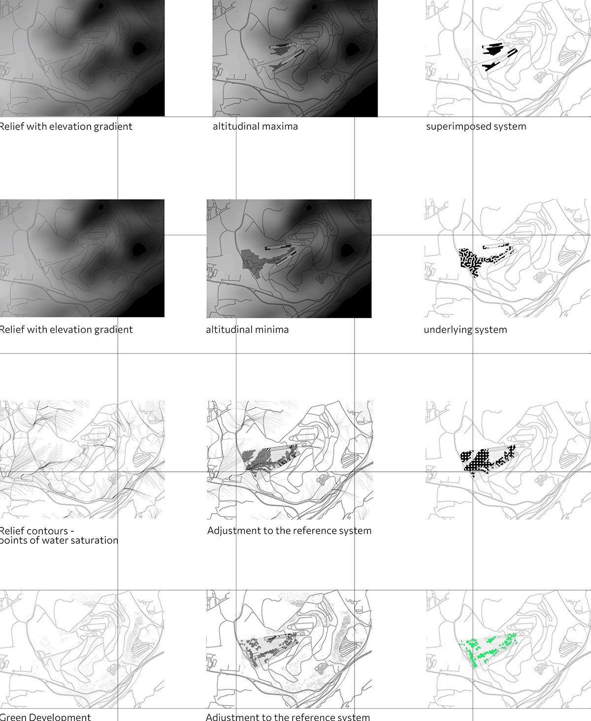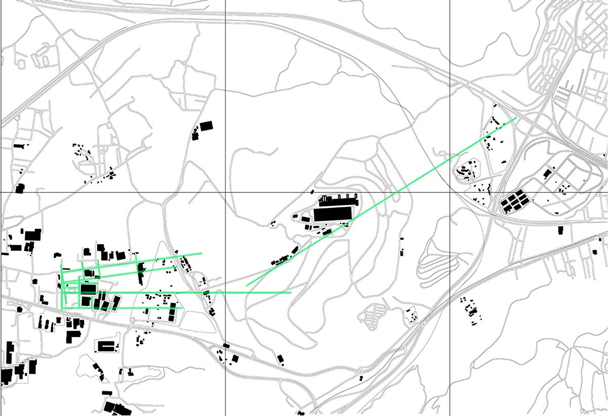 Points of retreat of existing boundaries serve as a guide for the placement of the structures. Three distinct alignments have emerged as a result of the geological boundaries between Parnitha and Poikilo, the lines dividing the “old” and “new” waste management areas, and the constraints placed on the accumulation structures to the west by the existing organisational structures. These alignments use three distinct grids to create a network that serves as the proposal’s reference system.