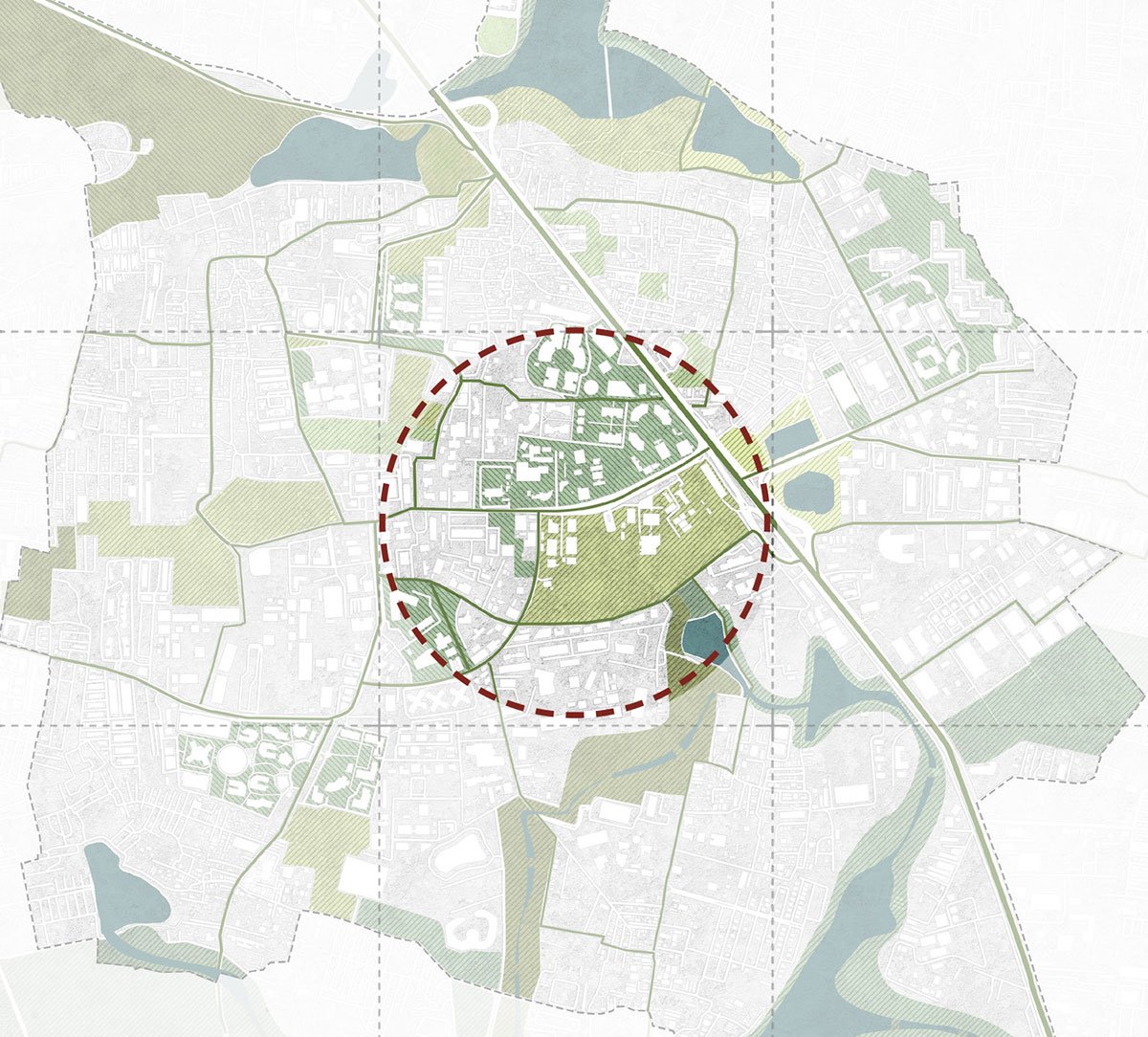 The forest axis continues into the site in the form of urban forests and wetlands, while the farm axis continues in the form of urban farms, orchards and meadows. The spaces like recreational grounds, parks, private green areas and finally the linear boulevards act as transition spaces between both the axes. Parallely, the blue connections in the form of lakes and canal extensions aid in the creation of a holistic green-blue infrastructure plan of the study area.